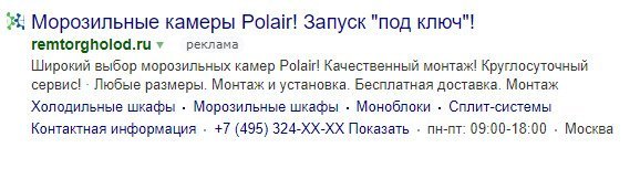 Подготовили объявления для Поиска и РСЯ. В креативе на Поиске - четкое соответствие заголовка ключевой фразе. Особенно это касается узкоцелевых потребностей, где клиенты указывают марку холодильного оборудования. Здесь же прописали минимальный ценник, гарантии и УТП.