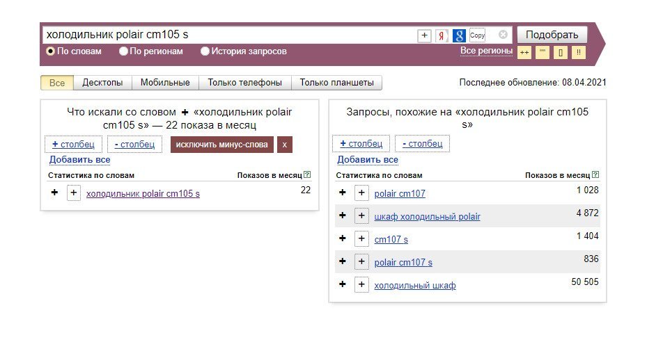 Запрос вроде «Льдогенератор Polair» имеет почти нулевую частотность, а нам нужен реальный трафик. Используя низкочастотные, а порой и микронизкочастотные запросы, мы рисковали получить статус «Мало показов» с последующей остановкой кампании. Однако у нас был четкий план действий.