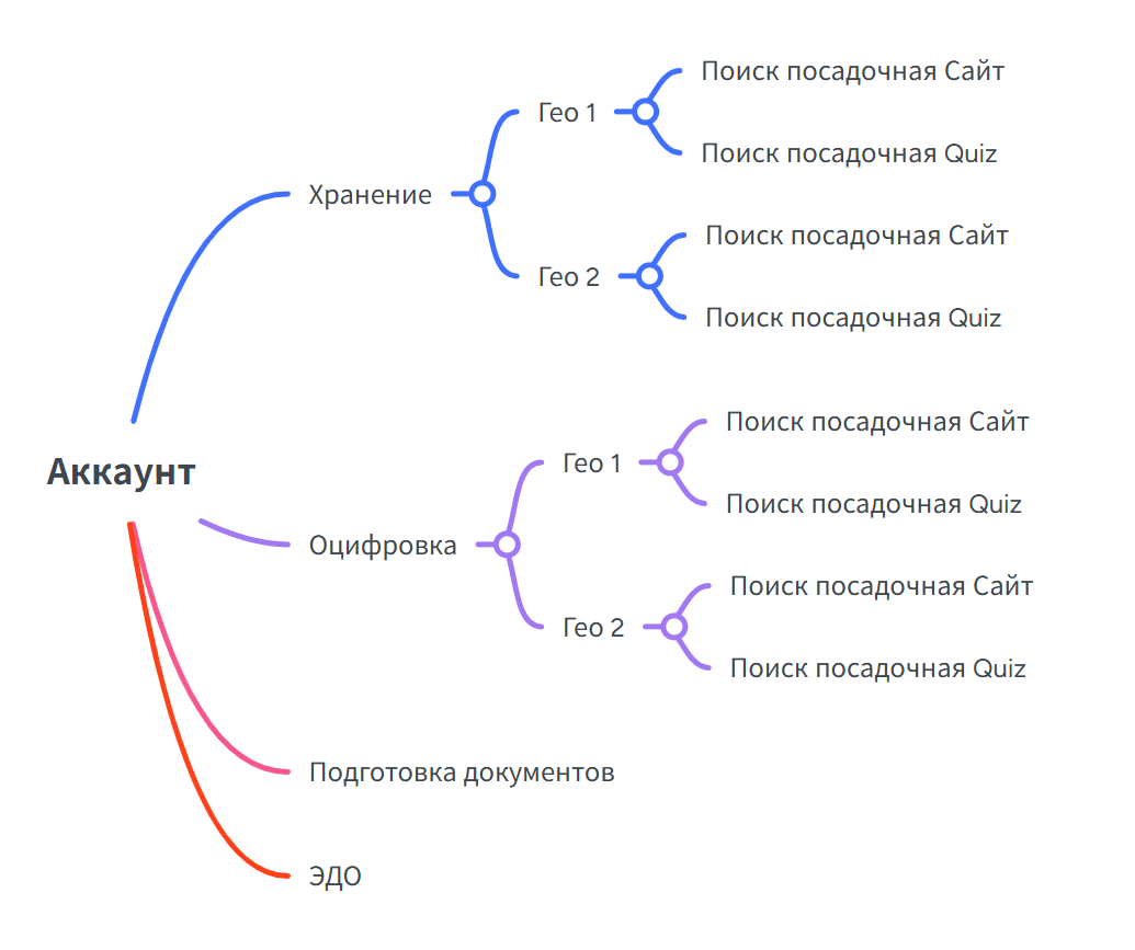 Каждое направление бизнеса («Хранение», «Оцифровка», «Подготовка документов», «ЭДО») мы выделили в отдельные кампании, чтобы видеть эффективность отдельно по каждому из них.