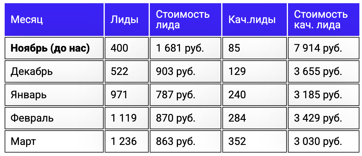 – Снизили бюджет на 30% в пользу поиска, т.к. качественные лиды с РСЯ оказались на 15% дороже.