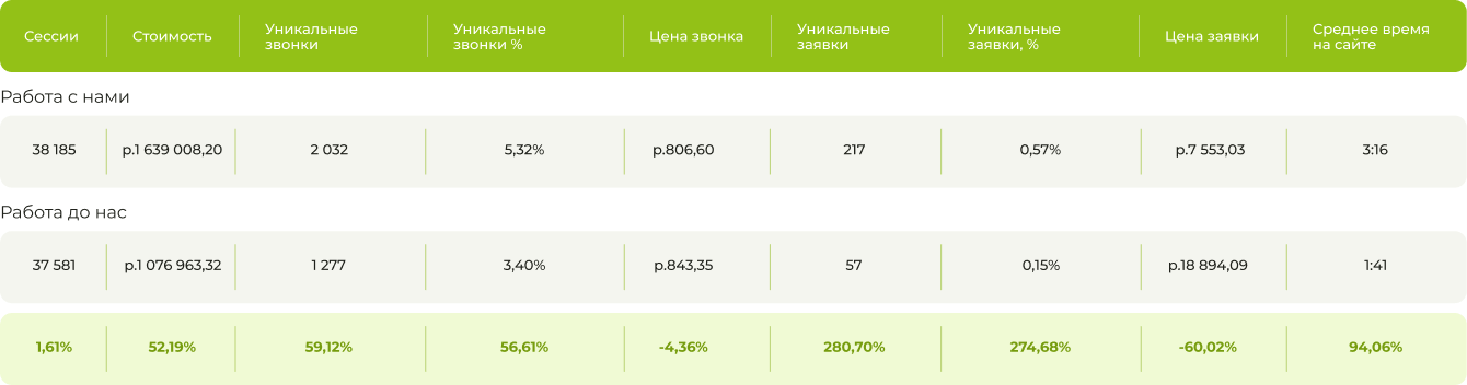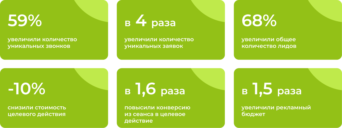 В результате маркетинговых усилий удалось значительно увеличить количество уникальных звонков и заявок, а также повысить конверсию из сеанса в целевое действие. Стоимость целевого действия была снижена на -10%, несмотря на увеличение рекламного бюджета в 1,5 раза.