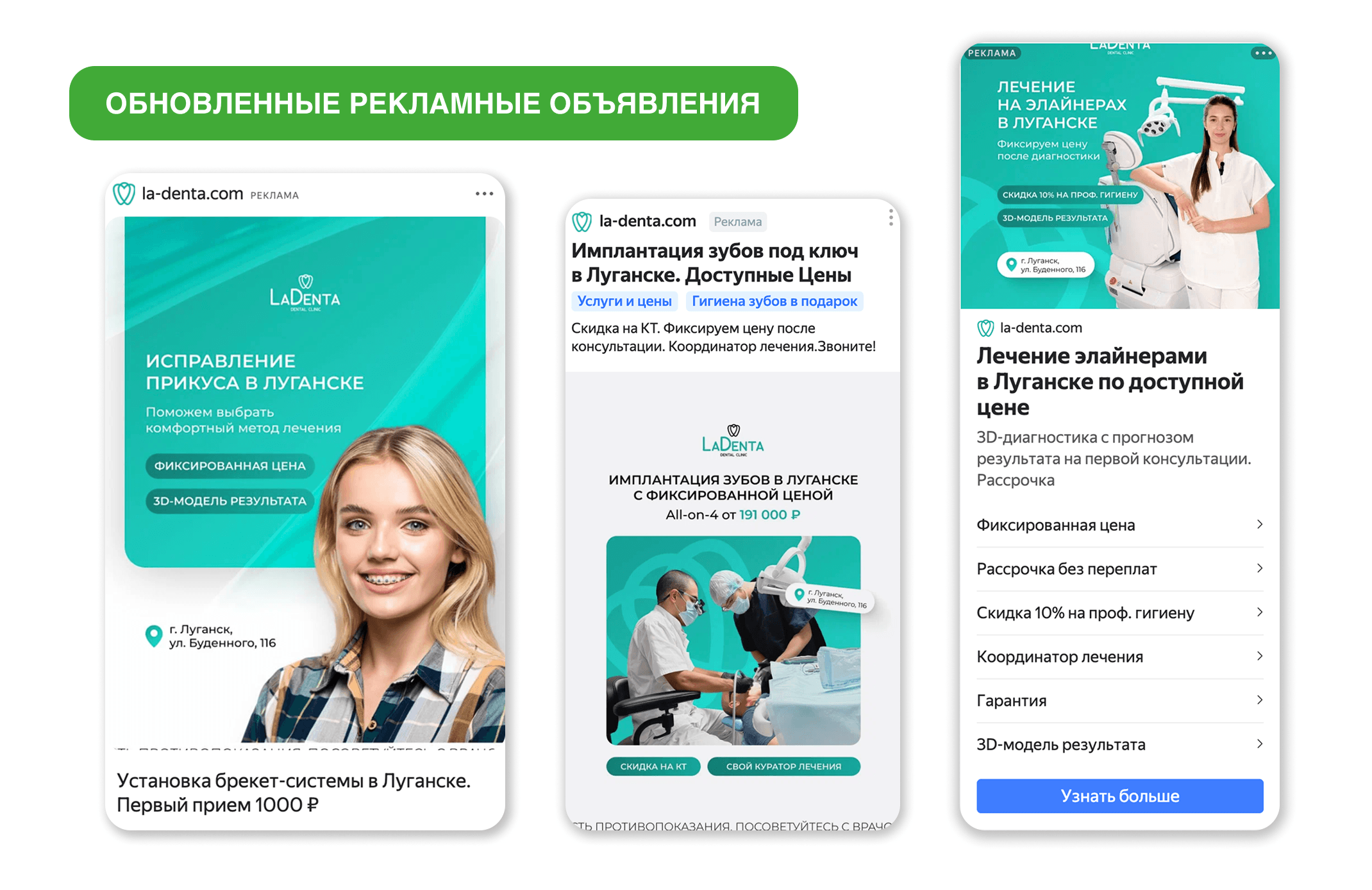 Следующим этапом стало усиление рекламной подачи: обновили УТП, офферы, разработали новые тексты объявлений и баннеры. Для имплантации сделали акцент на рассрочке, фиксированной цене на лечение, скидке на КТ, кураторе лечения и честной консультации без навязывания. Для ортодонтии — на 3D-диагностике с прогнозом результата, точном расчете стоимости, фиксации цены и скидке на профгигиену.