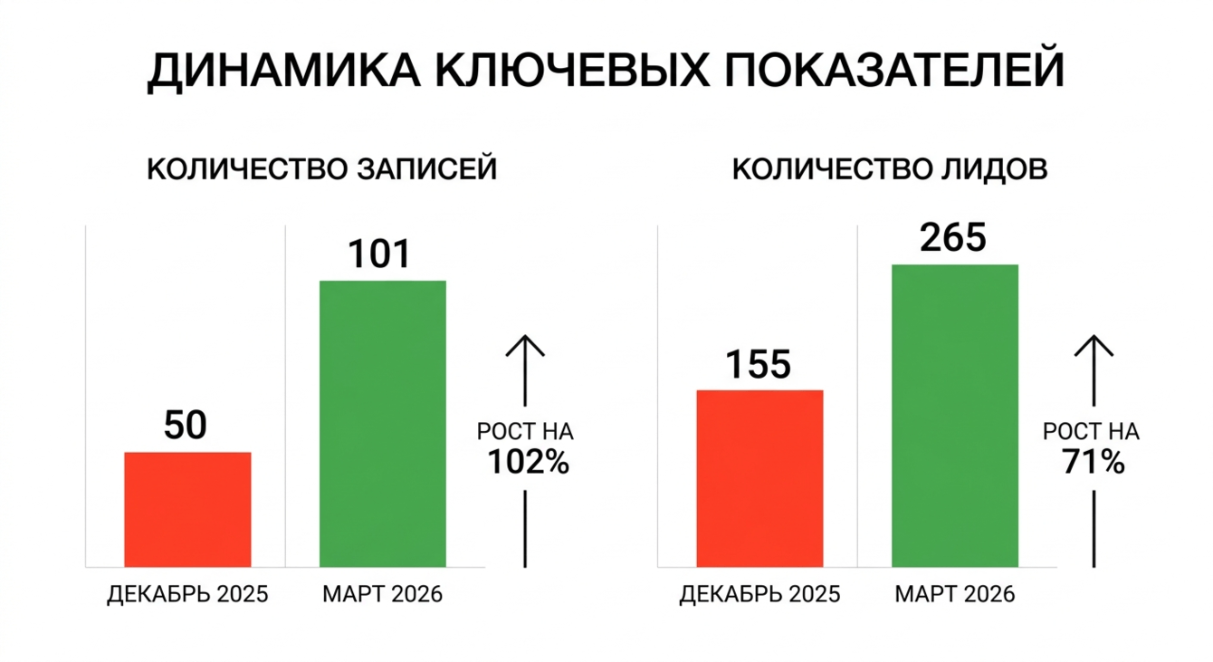 За период с декабря 2025 по март 2026 года количество записей в клинику выросло с 50 до 101 в месяц. Это рост на 102%. Именно этот показатель стал главным результатом работы, поскольку основной целью продвижения было не просто увеличение трафика или количества лидов, а рост числа пациентов, дошедших до записи.