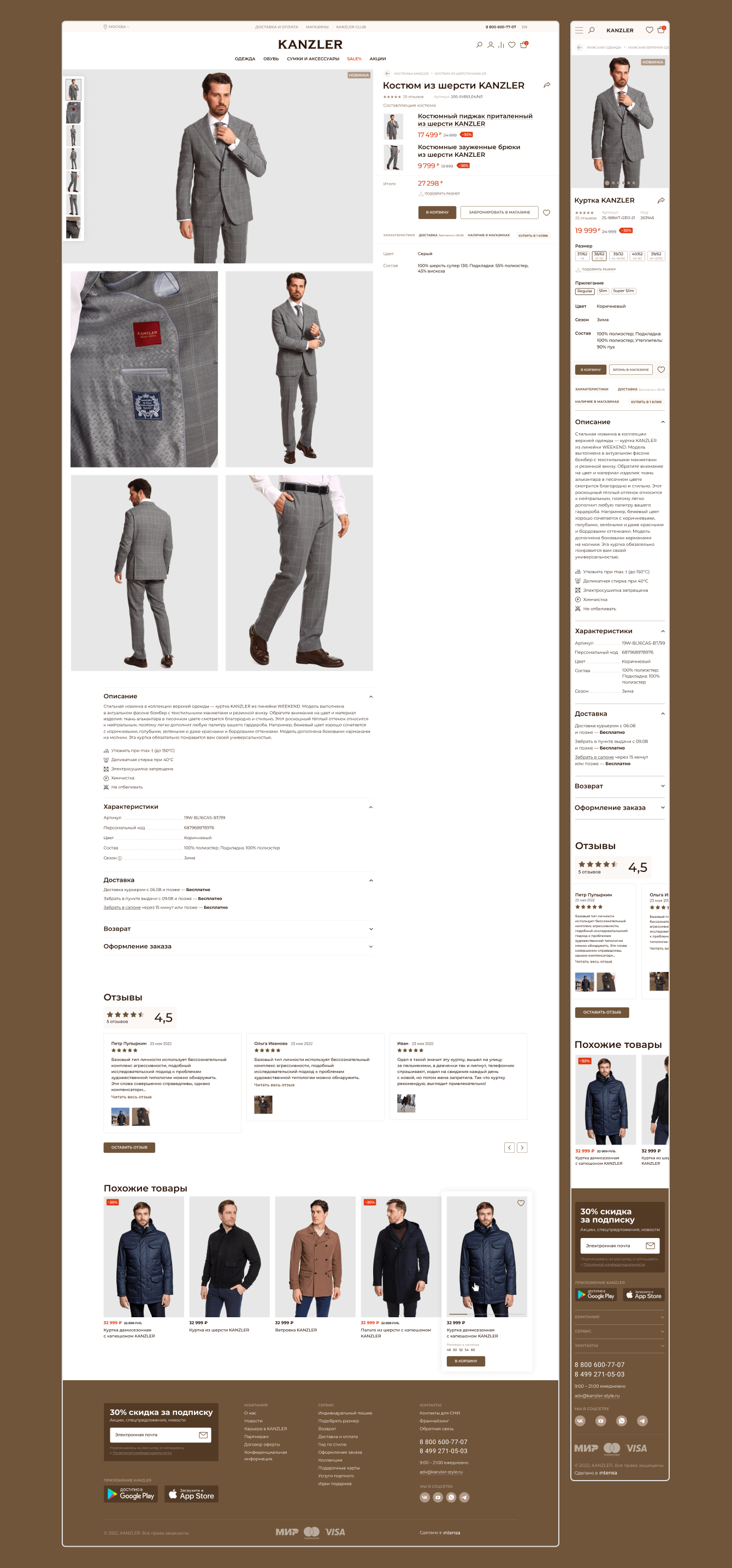Дизайн должен быть интересным, но и не заточенным под конкретный узкоспециализированный визуал, чтобы у нашего клиента не возникало сложностей с подготовкой фотографий товаров. Для карточек костюмов и обычных товаров — нужно прийти к единому варианту, чтобы помочь посетителям с навигацией по магазину и упростить поиск товаров в целом.