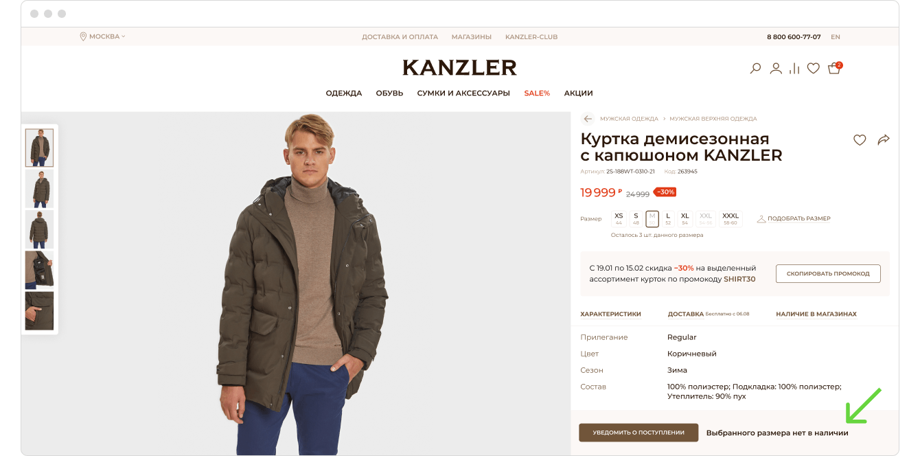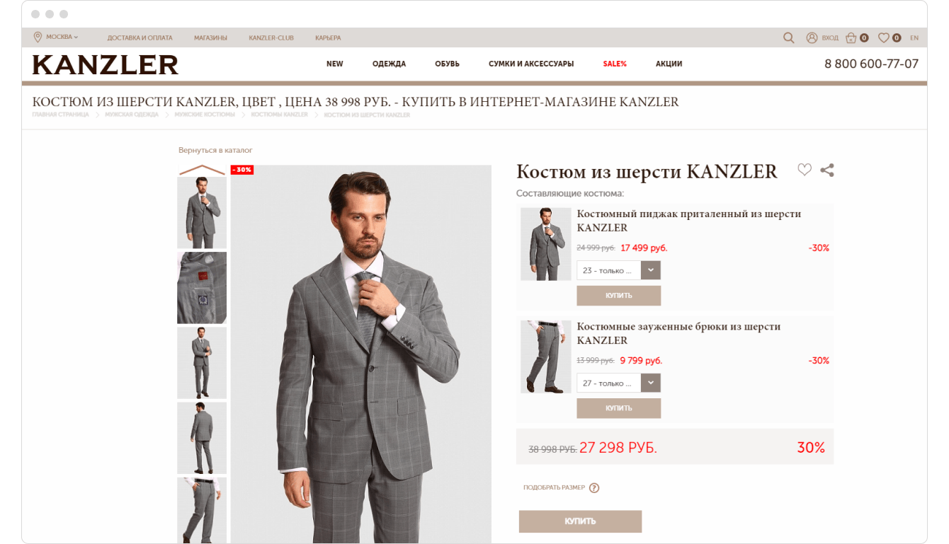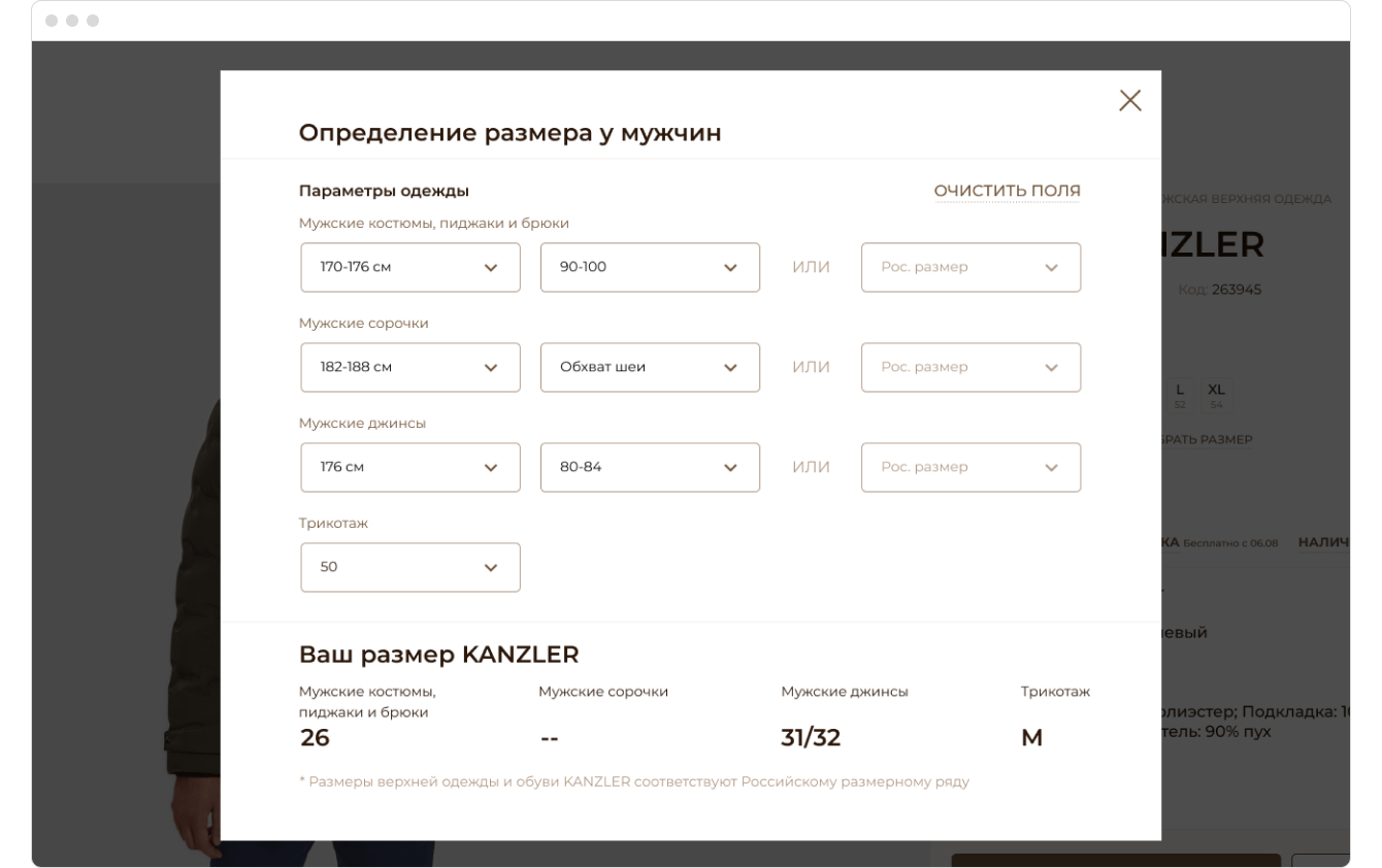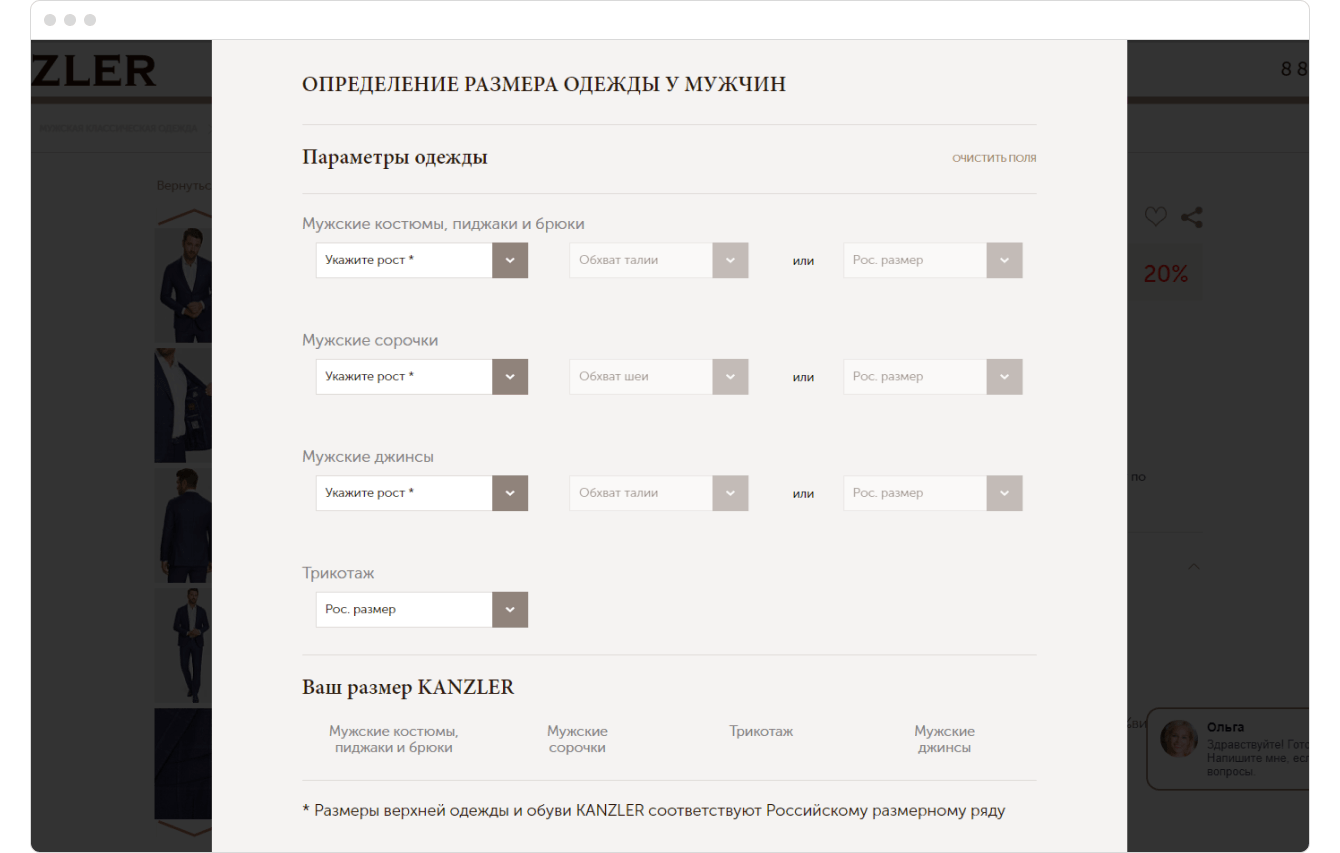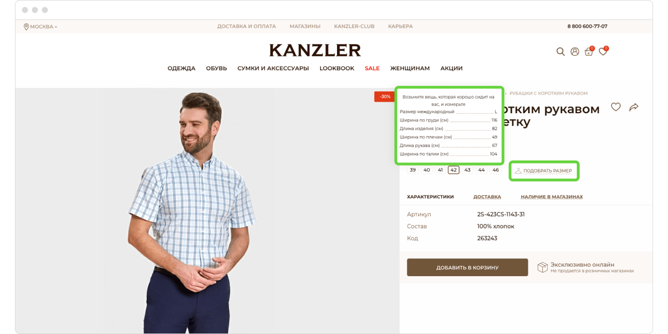 Выбор размера в старом дизайне карточки товара был неудобен для новых пользователей, которые не знакомы с размерами Kanzler. Например, в разделе рубашек покупателю было сложно сориентироваться в многообразии размеров.