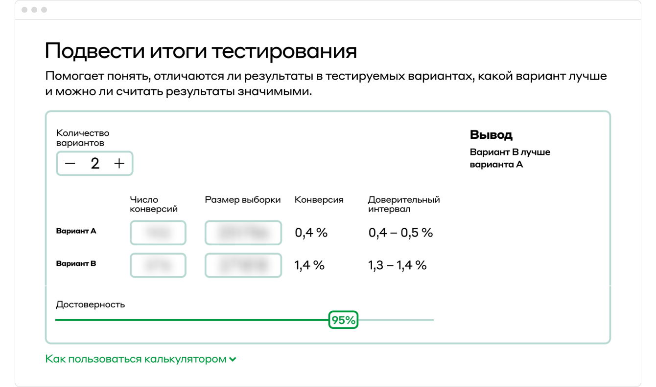 Доверительный интервал — конверсия при указанном уровне значимости. По умолчанию — 95%, то есть конверсия с вероятностью 95% находится среди значений доверительного интервала.