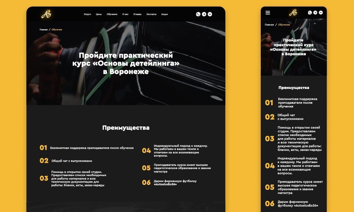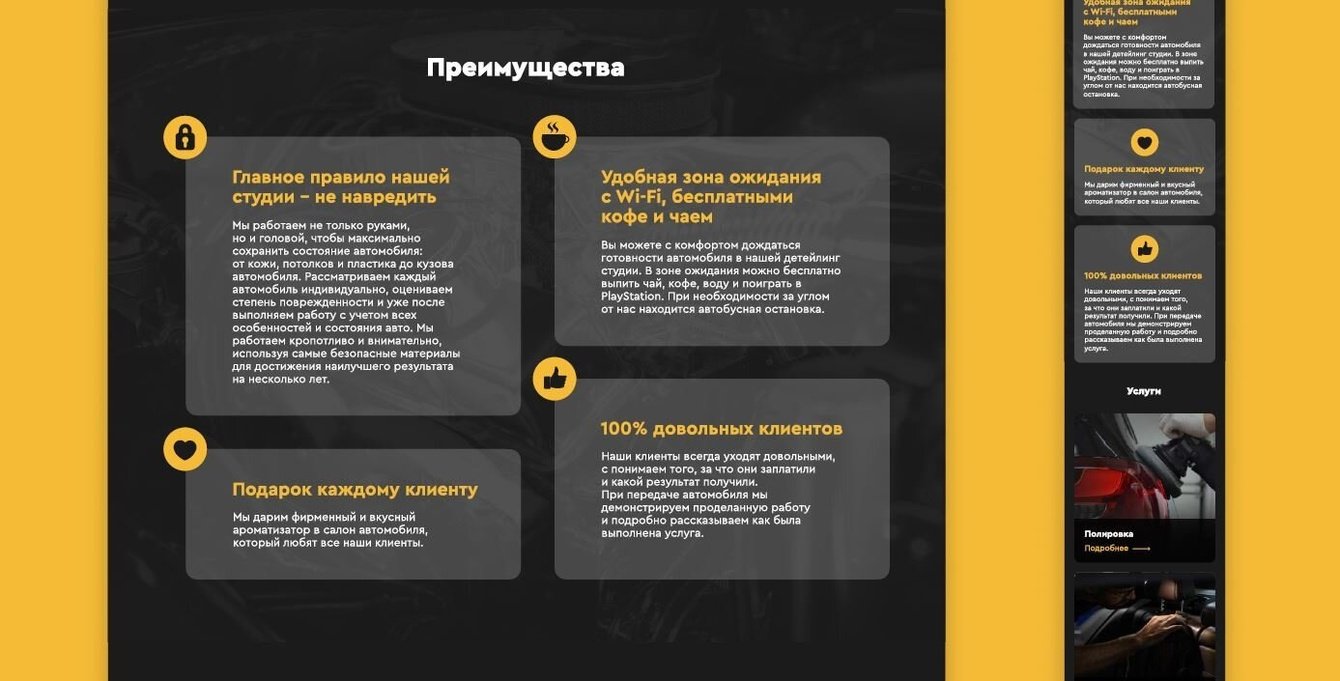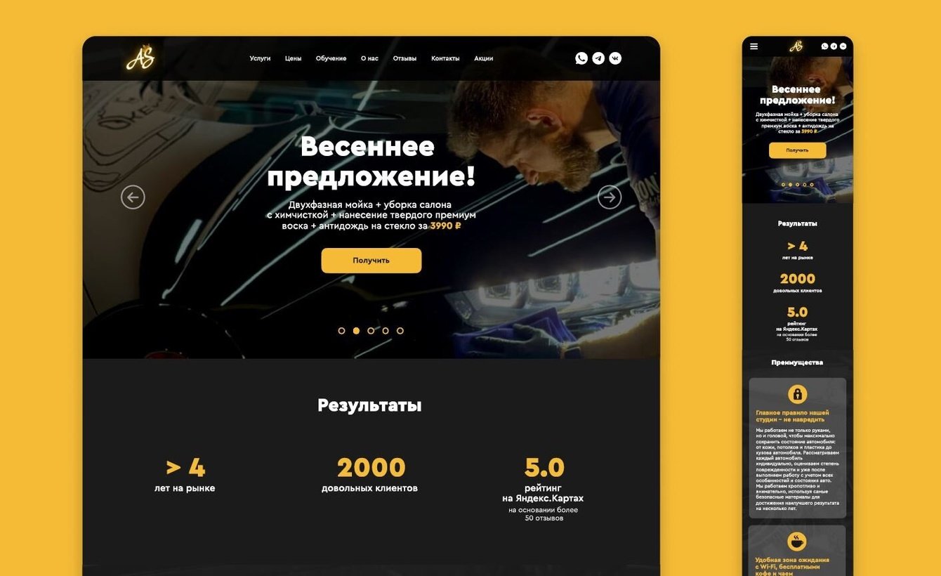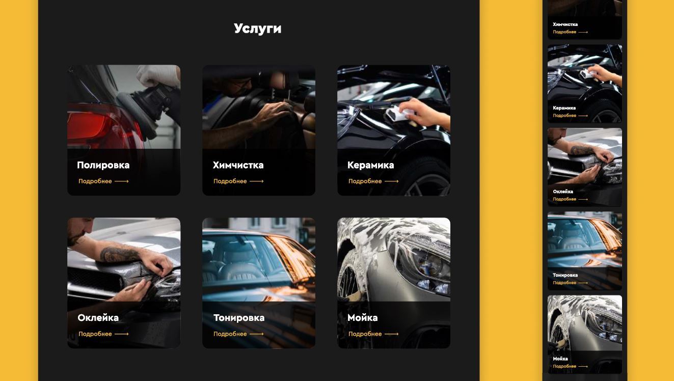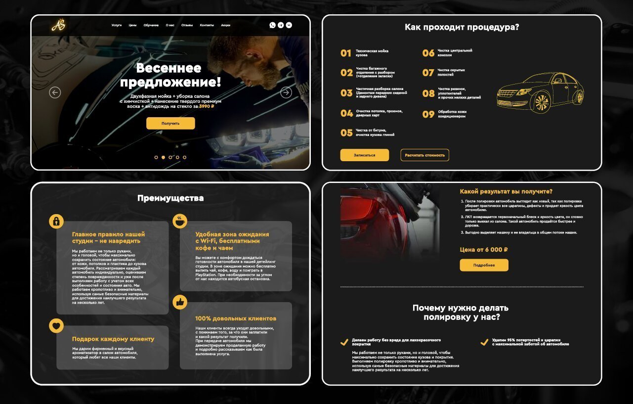 Сделать редизайн сайта опираясь на корпоративные черно-желтые цвета и анализ конкурентов. Сформировать новую визуальную концепцию сайта, переделать структуру сайта, написать продающие тексты, которые понятно доносят клиентам ценности детейлинг центра. Сделать адаптивы, так как 90% целевой аудитории посещают сайт с телефона.