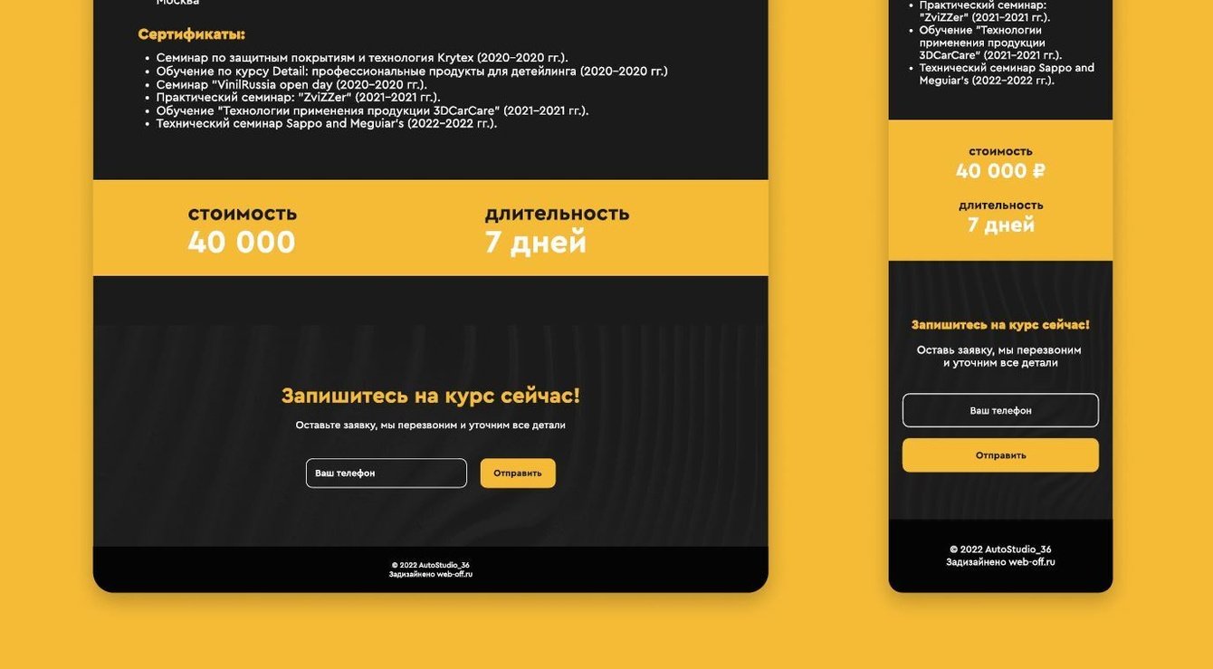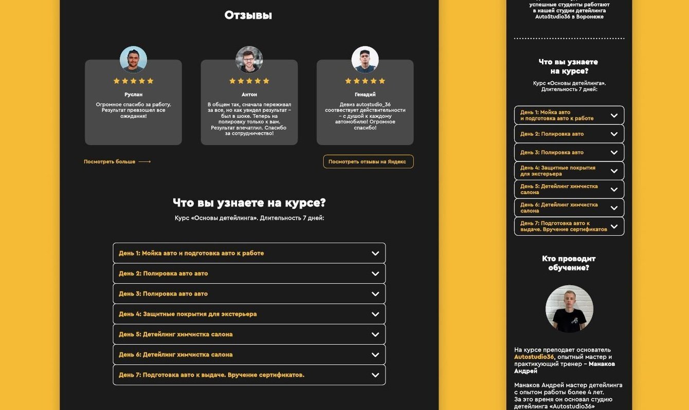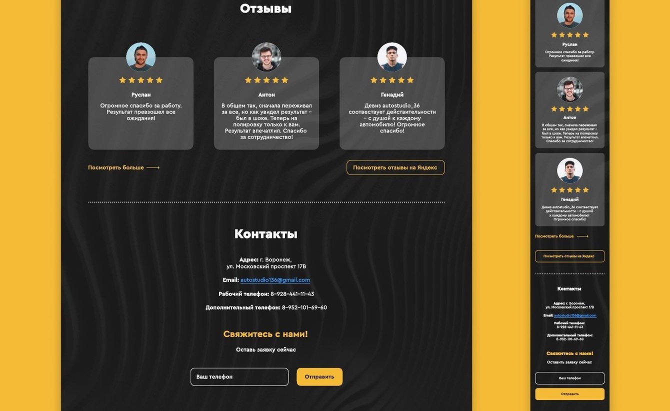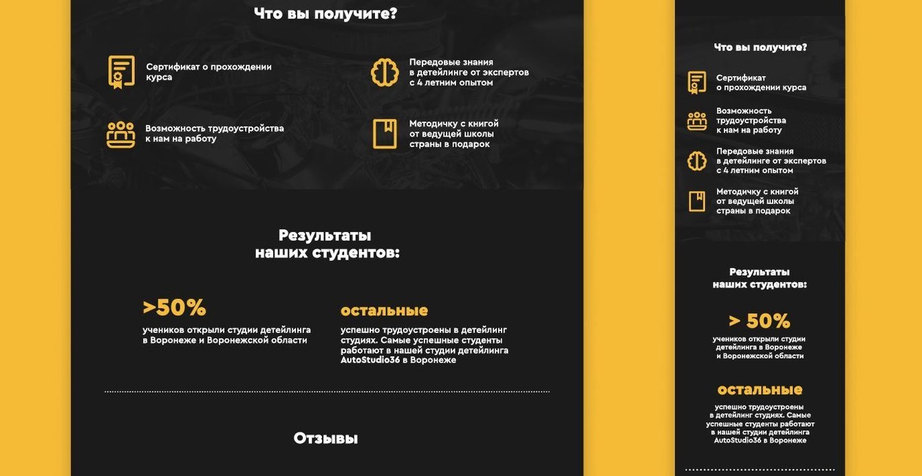 Сделать редизайн сайта опираясь на корпоративные черно-желтые цвета и анализ конкурентов. Сформировать новую визуальную концепцию сайта, переделать структуру сайта, написать продающие тексты, которые понятно доносят клиентам ценности детейлинг центра. Сделать адаптивы, так как 90% целевой аудитории посещают сайт с телефона.