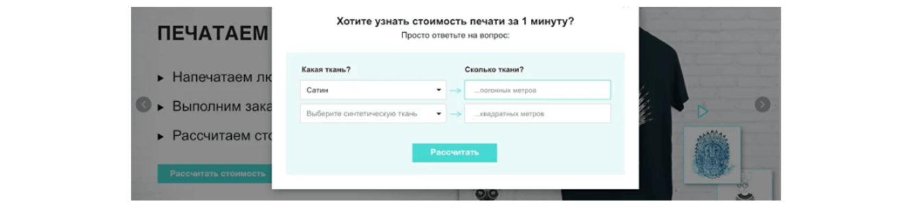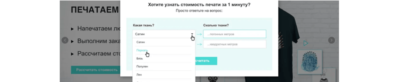 Так как ключевой фактор, который влияет на принятие решения пользователем, — это цена, мы разработали форму быстрого расчета стоимости в зависимости от типа ткани и размера. Поп-ап появляется при попытке покинуть сайт, а также после определенного времени пребывания на сайте.