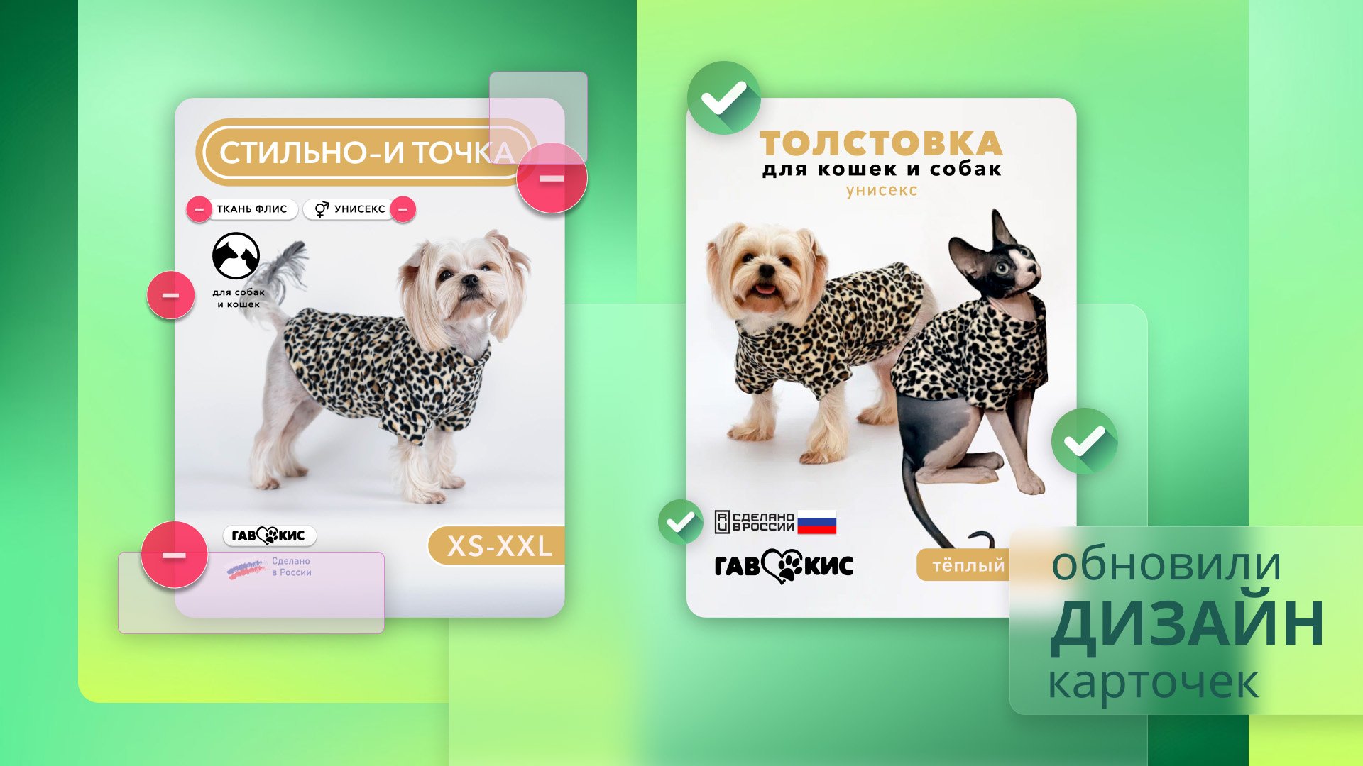 — Мы поняли, что среди наших покупателей как хозяева собачек, так и котиков и изменили позиционирование карточек: добавили на первое изображение второе животное так, чтобы охватить всех.