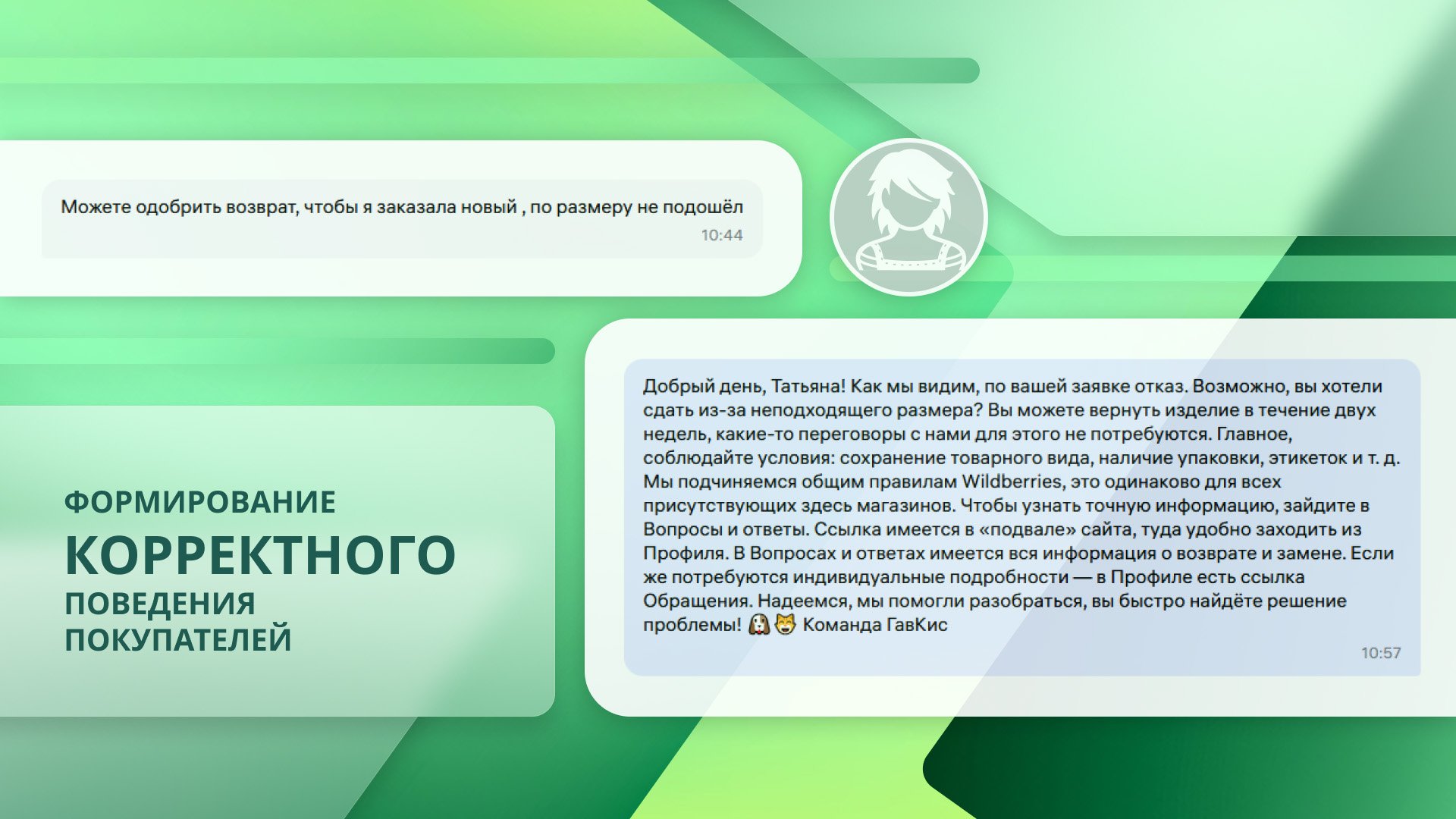 — Отвечали на сообщения в чате. Мы столкнулись с проблемой: некоторые покупатели делали возврат товара надлежащего качества не через стандартную процедуру, а через «Сдать по браку». Это невыгодно магазину и неправильно в целом. Приходилось объяснять, как именно нужно вернуть товар, если не подошел размер.