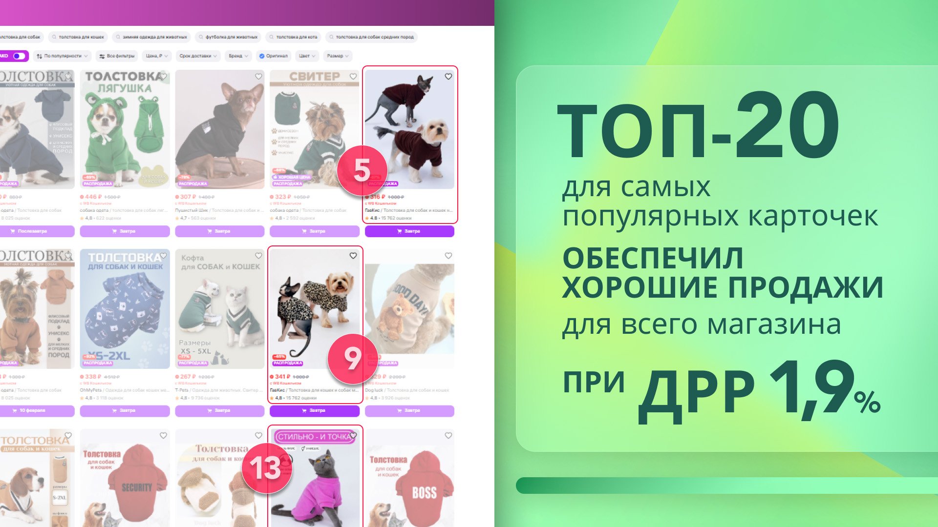 — Ранее клиент не использовал рекламу, и это было возможно. С ростом конкуренции — а ниша одежда для животных за 2024 год выросла очень сильно — поисковая выдача заполняется рекламными объявлениями, и на момент начала нашей работы по большинству запросов 100% первой страницы было занято рекламой. Мы внедрили рекламные кампании на постоянно основе и за счет тщательной проработки смогли ограничить ДРР 4%.