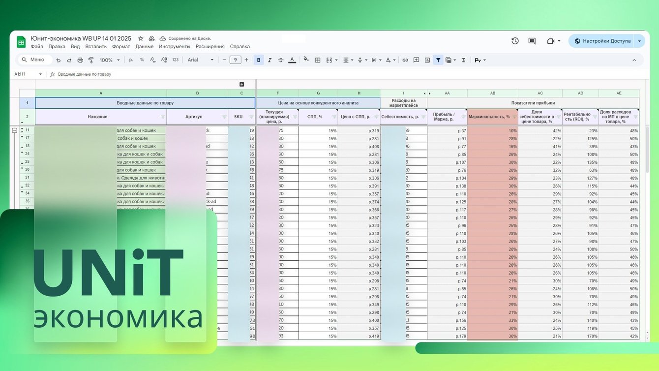 Сформировали таблицу с юнит-экономикой, которая учитывает в себе основные расходы магазина на WB, включая рекламные бюджеты и налоги. Во-первых, в ценообразовании важно учесть все расходы, чтобы итоговая прибыль соответствовала ожиданиям (а не только оборот продаж). Во-вторых, это удобный калькулятор, который позволяет быстро менять данные и получать нужные цены исходя из целей и меняющихся условий.