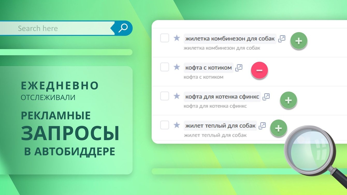 Постоянно оптимизировали рекламные компании, чтобы весь ассортимент товара был на главной странице по самым выгодным запросам. Ежедневно отслеживали рекламные запросы в автобиддере, так как есть много пересечений с другими категориями и исключали нерелевантные, например, «кофта с котиком», «леопардовая толстовка», «одежда с принтом кошечки» и прочее: