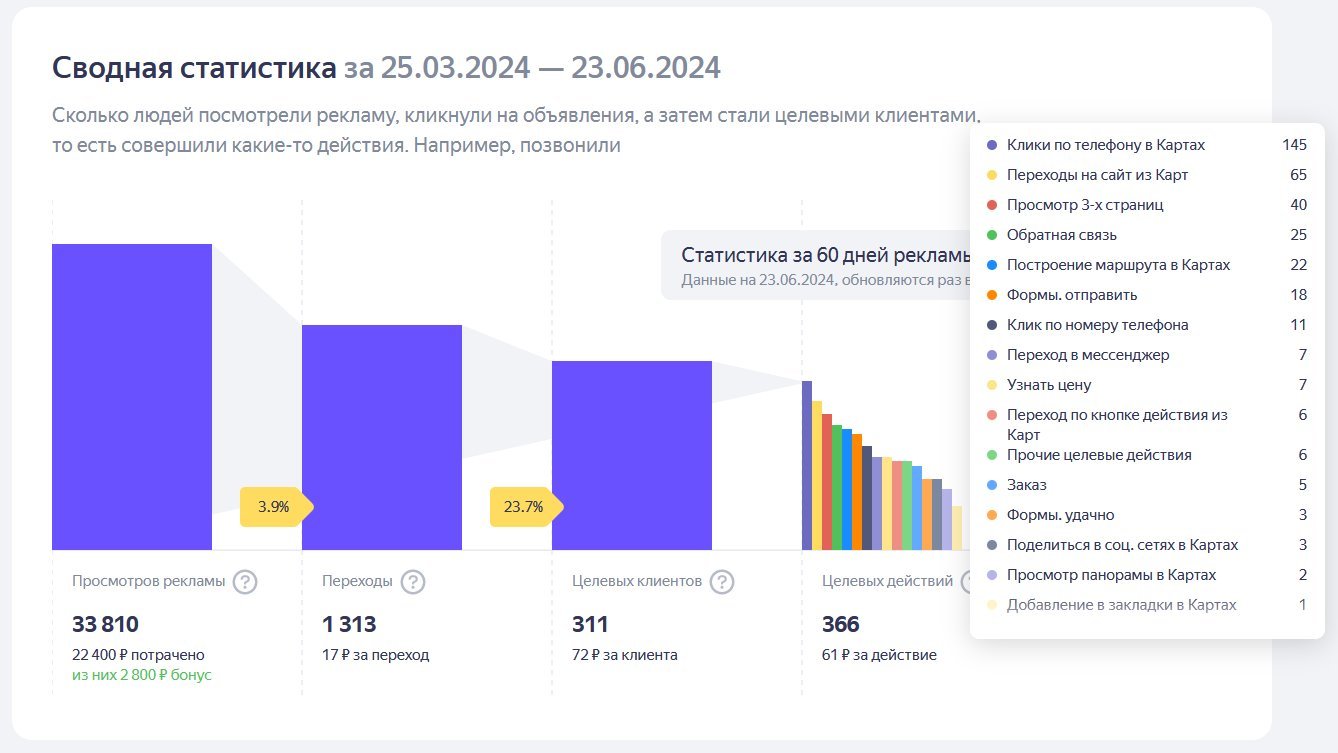 Затем мы приступили к запуску рекламы на Я.Картах, при этом провели анализ конкурентов, выяснили боли аудитории и проработали ключевые фразы. На основе проделанной работы мы добавили 20 объявлений, несколько позиций в витрину и акцию. Старт запуска: конец апреля..