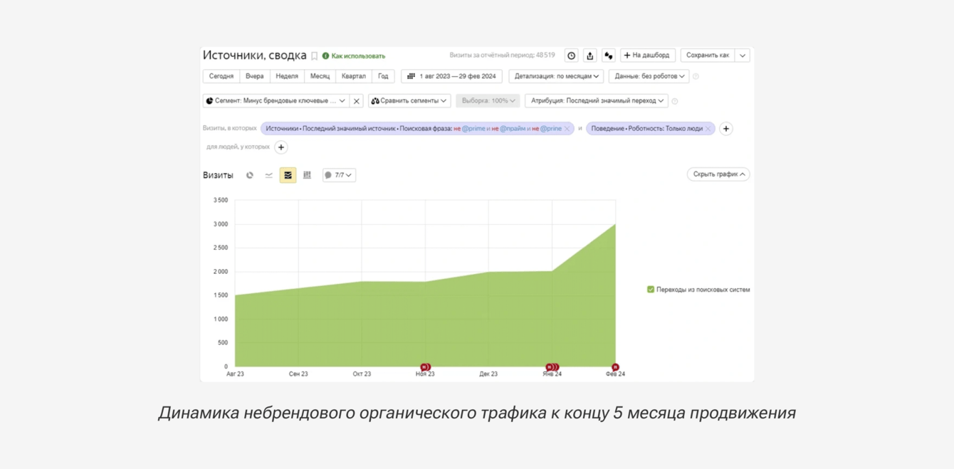 Небрендовый трафик: объем органического трафика за 5 месяц продвижения увеличился на 67% относительно 1 месяца.