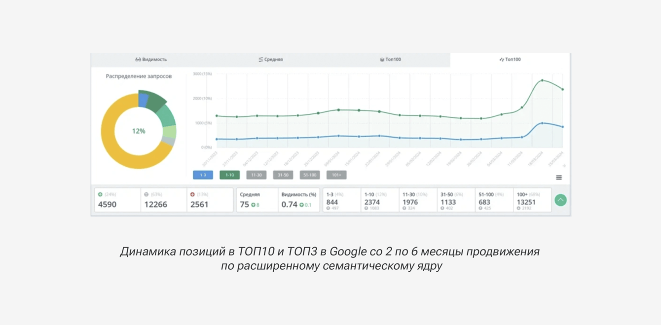 Расширенное СЯ: Google проиндексировал более 2000 страниц, и количество запросов в ТОП-10 Google увеличилось с 7% до 14% +1444 запросов, выросли позиции у 24% запросов.