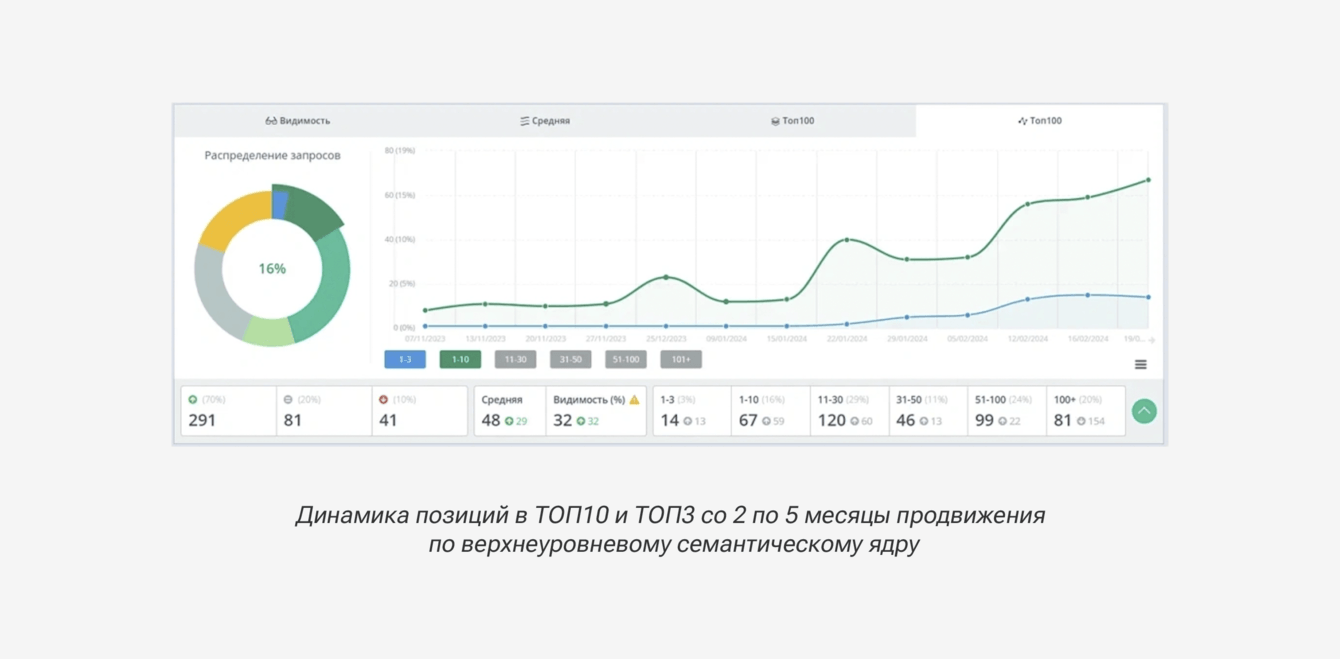 Верхнеуровневое СЯ: количество запросов в ТОП-10 Яндекса увеличилось с 3% до 16%, видимость сайта в поиске с 0 до 32%, выросли позиции у 70% запросов.