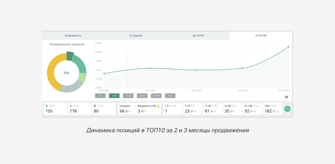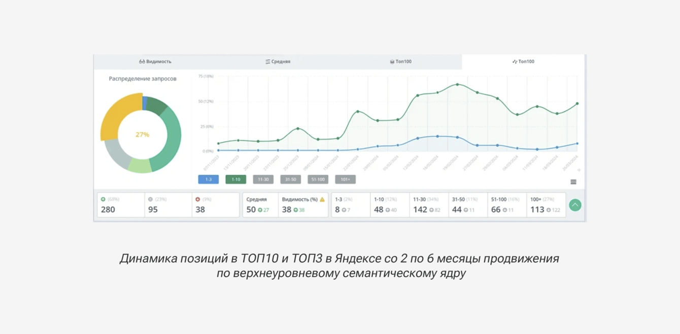 По итогам 3 месяца продвижения количество запросов в ТОП-10 Яндекса увеличилось с 3% до 6%, видимость сайта в поиске с 0% до 3%, выросли позиции у 38% запросов из верхнеуровневого семантического ядра.