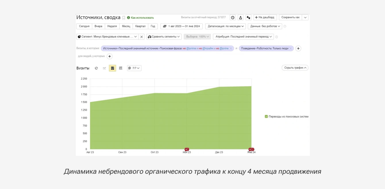 С 1 по 4 месяц продвижения объем небрендового органического трафика вырос на 12%.