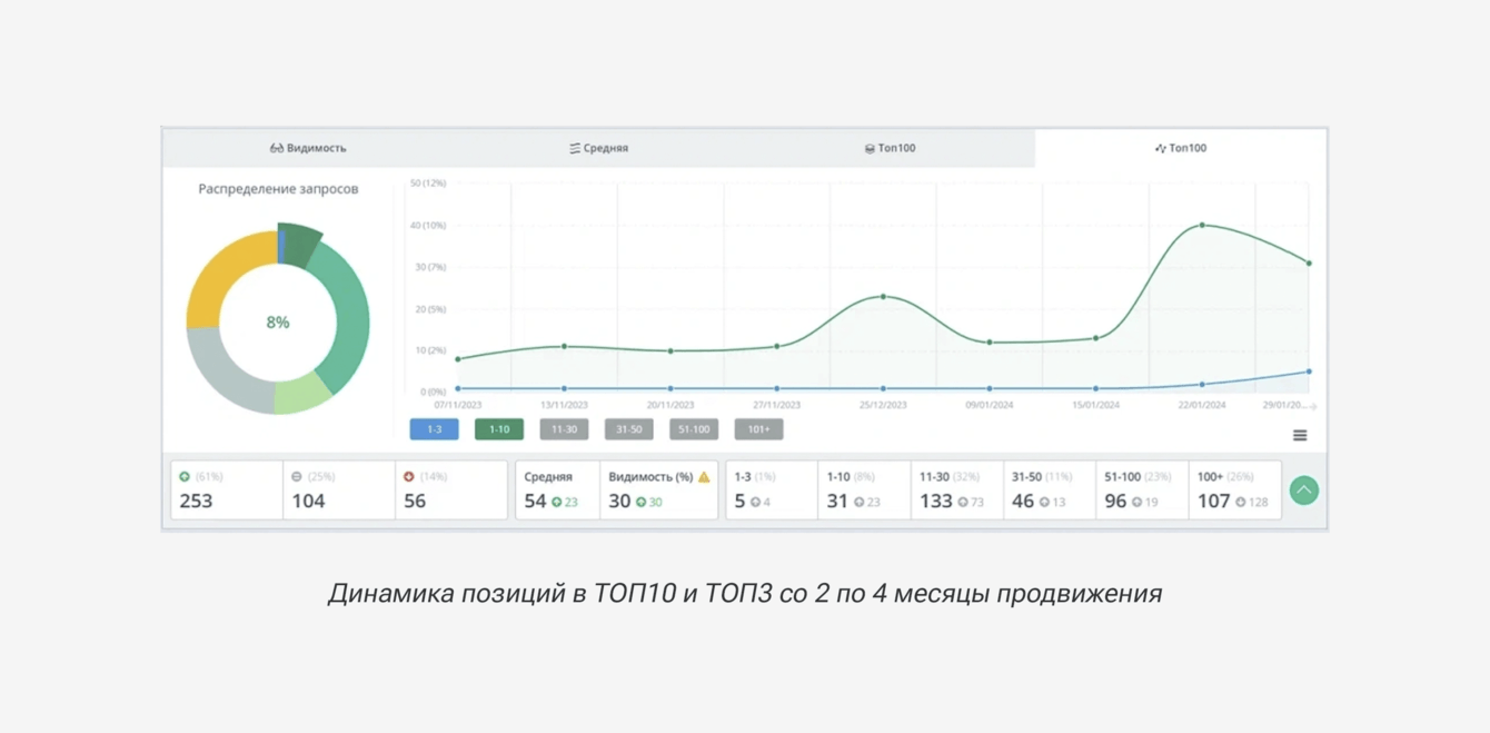 По итогам 4 месяца продвижения количество запросов в ТОП-10 Яндекса увеличилось с 3% до 8%, видимость сайта в поиске с 0 до 30%, выросли позиции у 61% запросов из верхнеуровневого семантического ядра.