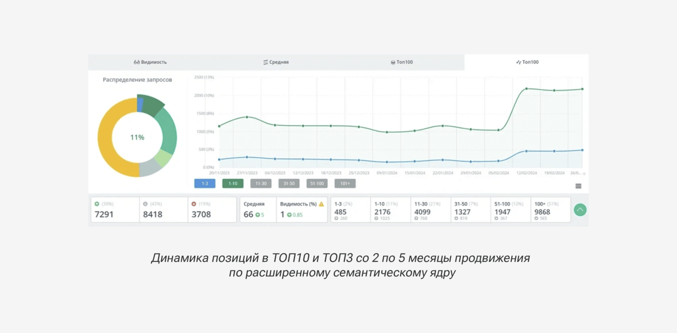 Расширенное СЯ: количество запросов в ТОП-10 Яндекса увеличилось с 6% до 11% +1025 запросов, выросли позиции у 38% запросов.