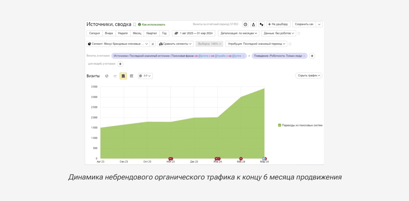 Небрендовый трафик: объем органического трафика за 6 месяц продвижения увеличился на 90% относительно 1 месяца.
