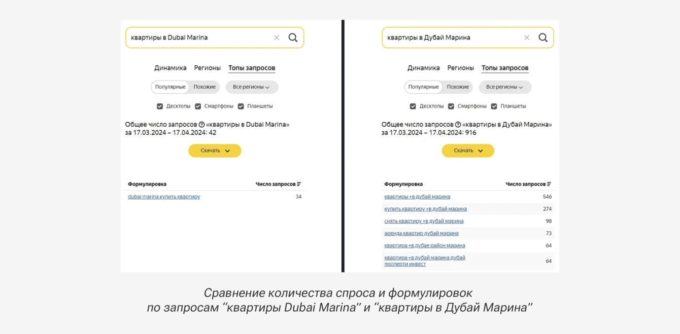 Интересное: в семантическое ядро включали запросы с транслитерированными названиями ЖК Дубая, так как пользователи из России могут писать название русскими буквами, например, район “Dubai Marina” чаще пишут как “Дубай Марина”.
