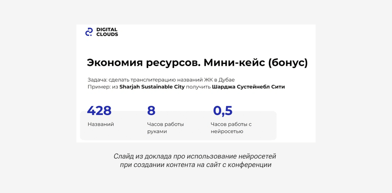 Для транслитерации названий воспользовались нейросетью GPT 3.5 и вместо потенциальных 8 часов работы руками потратили 30 минут на тестирование промпта, получение и проверку результата.