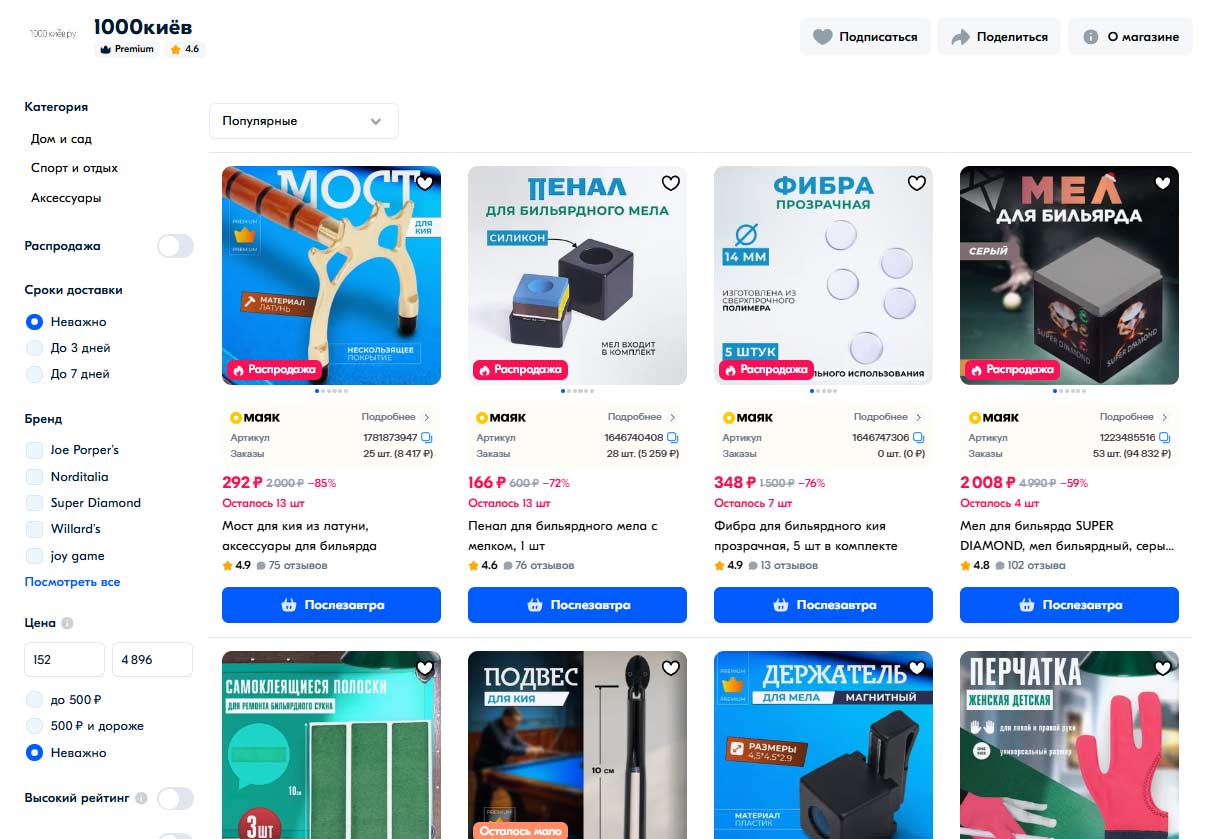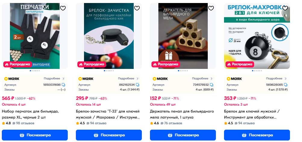 Основная проблема клиента была — поставка товаров ТОЛЬКО по формату FBS. После того, как мы уперлись в потолок и не смогли даже при увеличении матрицы товаров увеличить объем продаж, было рекомендовано тестово поставить 1 самый продаваемый товар по формату FBO. Это был мел для бильярда, из-за долгих сроков доставки товар просел в продажах. Нам удалось уговорить клиента сделать поставку через ПВЗ, так как это не требует больших затрат, чем поставка по FBS, после чего продажи пошли вверх. За 4 месяца было поставлено также еще несколько товаров по FBO, на которые начался большой спрос. Это привело к увеличению выручки в 4 раза за 4 месяца.