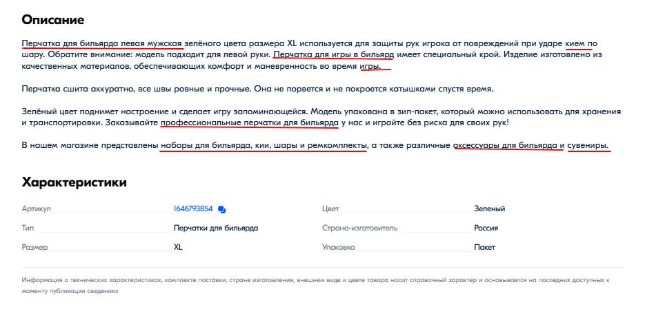 Все ключи поместили в раздел «Описание» и «Характеристики».