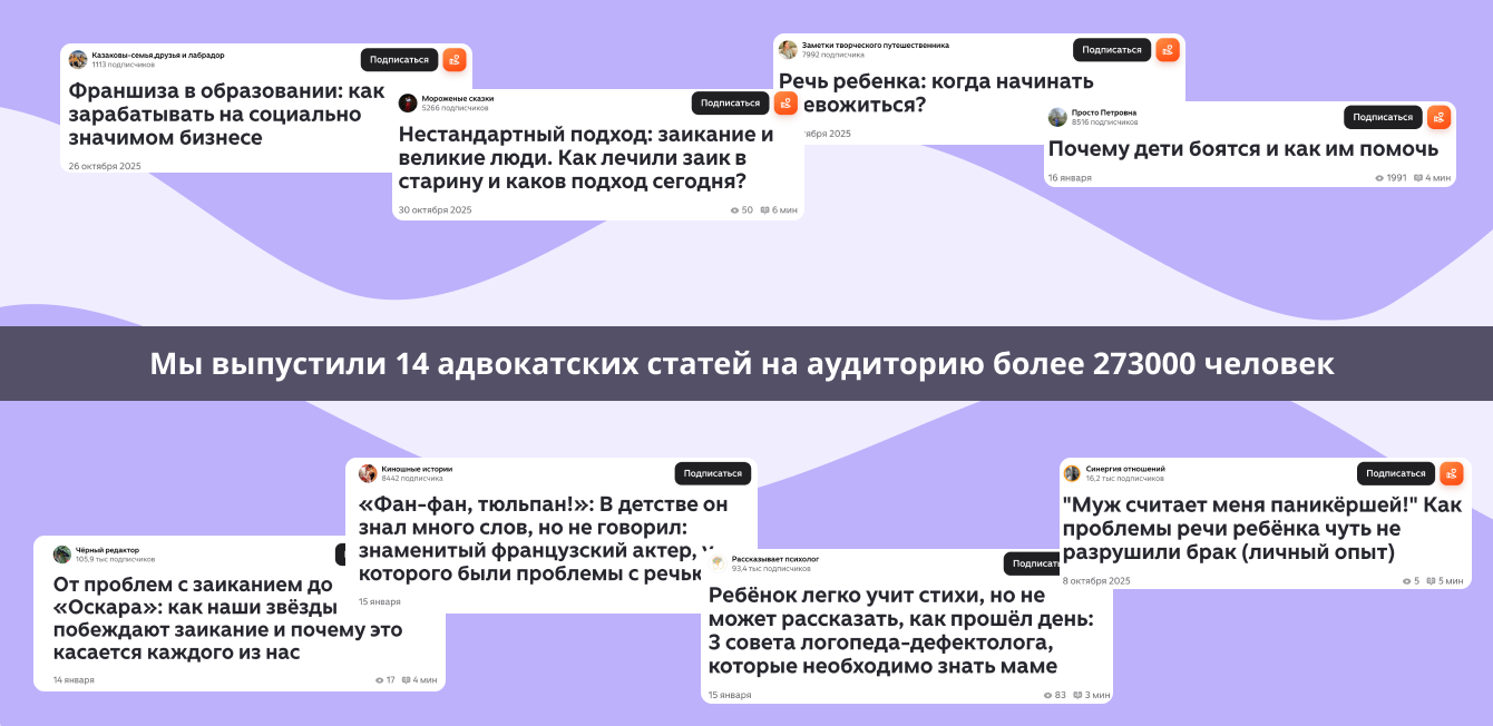 Отдельным направлением продвижения в рамках проекта стали адвокатские статьи у блогеров на платформе «Дзен». В этом формате блогеры привлекали спикеров компании в качестве отраслевых экспертов и через авторские материалы подчёркивали значимость логопедических услуг и их влияние на качество жизни.