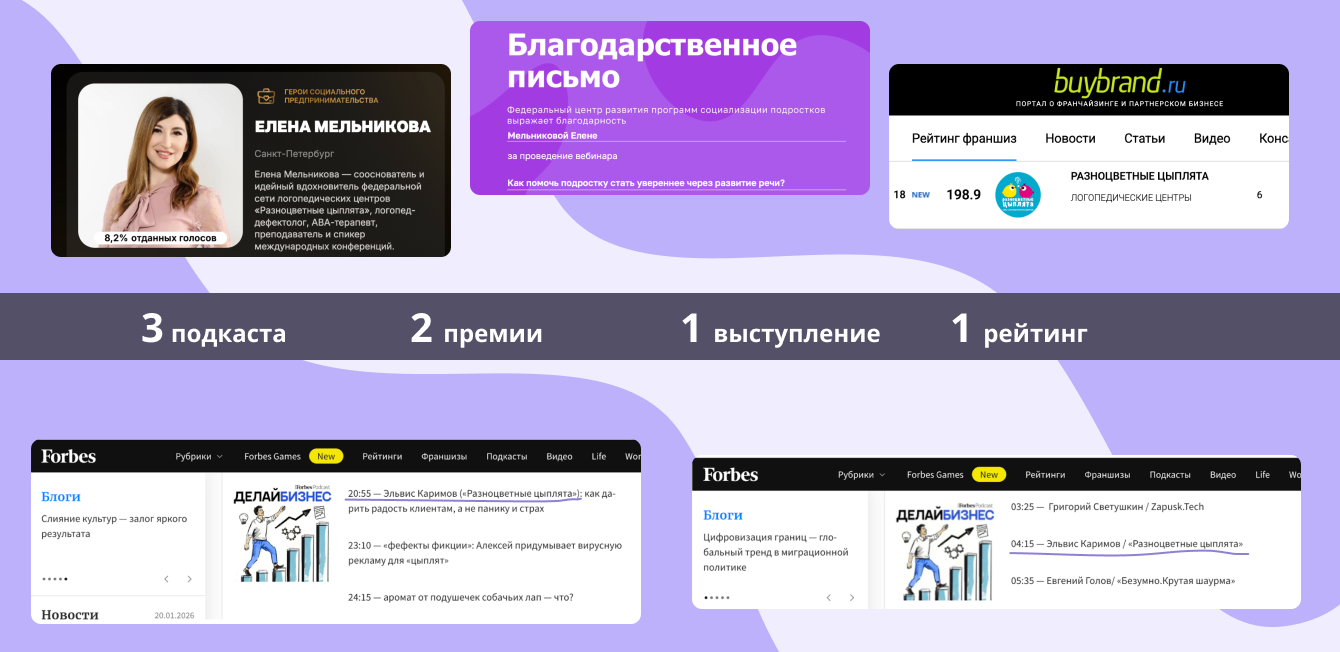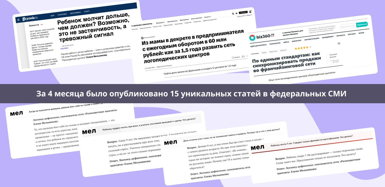 В коммуникациях был чётко разделён фокус экспертизы в зависимости от аудитории. В материалах о продукте акцент делался на логопедические услуги и практический опыт работы с речевыми нарушениями. В публикациях, ориентированных на предпринимательскую аудиторию, — на экспертизу в развитии социального бизнеса, франчайзинговой модели и управлении сетью.