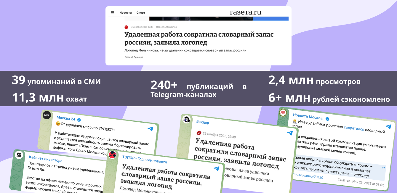 Одним из ключевых масштабируемых инфоповодов стал материал о влиянии удалённого формата работы на речь. Инфоповод показал высокую эффективность и стал драйвером органического распространения контента.