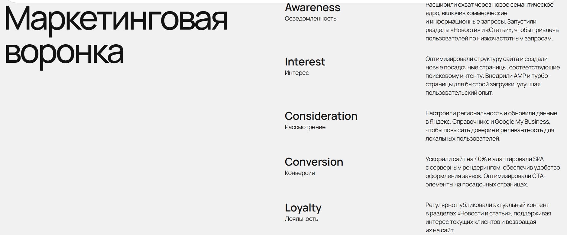 Отсутствие информационного контента ограничивало охват по низкочастотным запросам, а проблемы с региональностью в Google затрудняли продвижение в разных городах. Клиенту требовалось не только устранить эти барьеры, но и адаптировать сайт под современные технологии, такие как Single Page Application (SPA), AMP и турбо-страницы.