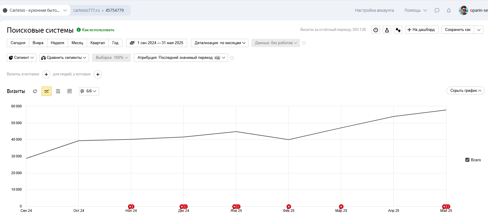 Проект оказался масштабным: сотни категорий, тысячи карточек товаров, сложная структура. Именно поэтому мы выстроили поэтапный SEO-план, где каждый этап логично дополнял предыдущий. Уже спустя несколько месяцев после начала работ мы увидели устойчивый рост трафика, а к маю 2025 года удалось выйти на показатель 57 758 уникальных посетителей в месяц только из органики.