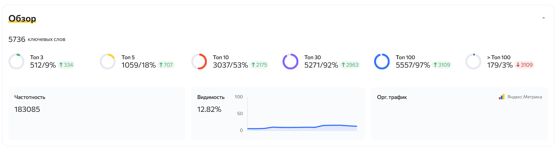 Основной рост пришёлся на Яндекс, что вполне логично — мы начали с работы над технической базой и релевантностью, что особенно ценно в этой поисковой системе. Работа над ссылочным профилем для Google стартовала только в 2025 году, и по нему ожидается отложенный эффект. Позиции у сайта в результате работ также выросли очень сильно и большое количество ключей попало в ТОП поисковой выдачи: