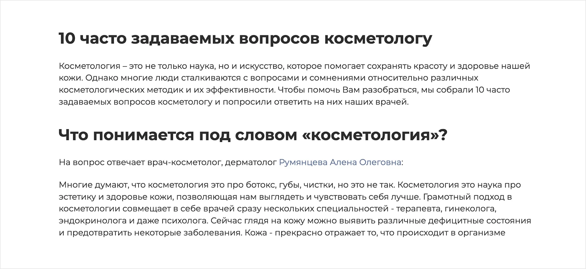 Все темы для публикаций проходят согласование с маркетологом и косметологами клиники. Тексты для нас пишет копирайтер с медобразованием. Затем их тщательно проверяют специалисты, с несколькими раундами правок: так статьи лучше раскрывают уникальный подход клиники. Такой процесс обеспечивает и релевантность, и экспертность материалов.