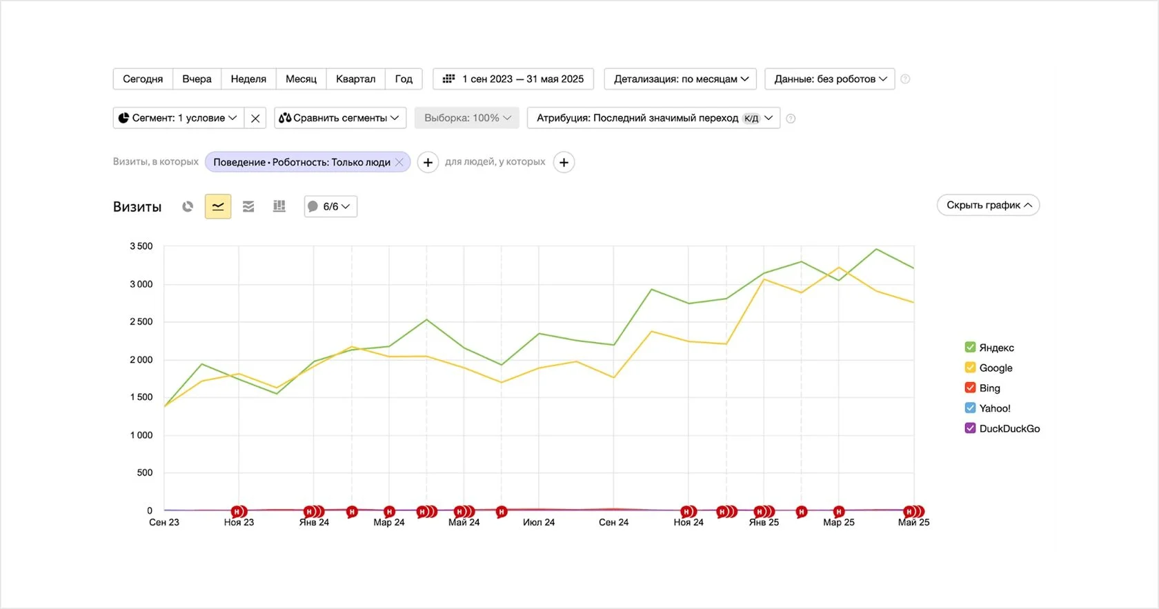 В период с сентября 2023 года по май 2025 года трафик на сайт клиник вырос в 2.1 раз в Google и в 2,3 раза в Яндекс. Несмотря на то, что сезонный спрос на косметологию падает в весенне-летний период, динамика на сайте нашего клиента остается положительной.