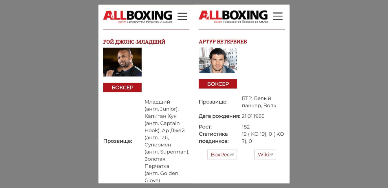 ✔️ Внедрили полноценные страницы бойцов. Раньше на страницах бойцов были расположены ссылки на внешние источники. То есть из новости про предстоящий бой человек уходил с AllBoxing на зарубежные ресурсы, пусть и авторитетные. Мы доработали страницы — теперь на них выводится вся привычная информация, но на русском языке. Плюс к странице «подтягиваются» новости, связанные с бойцом. Ссылки на внешние источники остались, но: