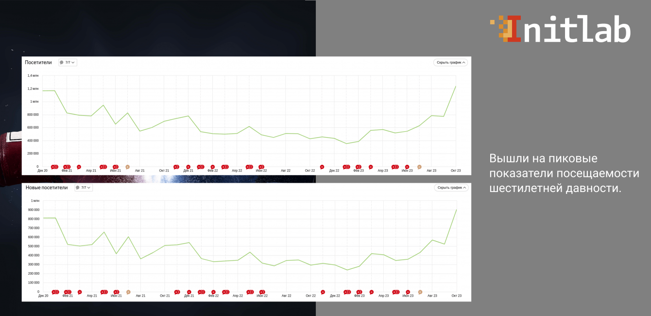 Клиент пришёл к нам в августе 2022 года изначально на поддержку сайта. Примерно в это же время была озвучена проблема сильного падения посещаемости — в тот момент на сайт заходило около 24 тысяч пользователей в день. Это неплохой показатель, но во времена отсутствия конкурентов, около 6 лет назад, сайт привлекал значительно больше посетителей.