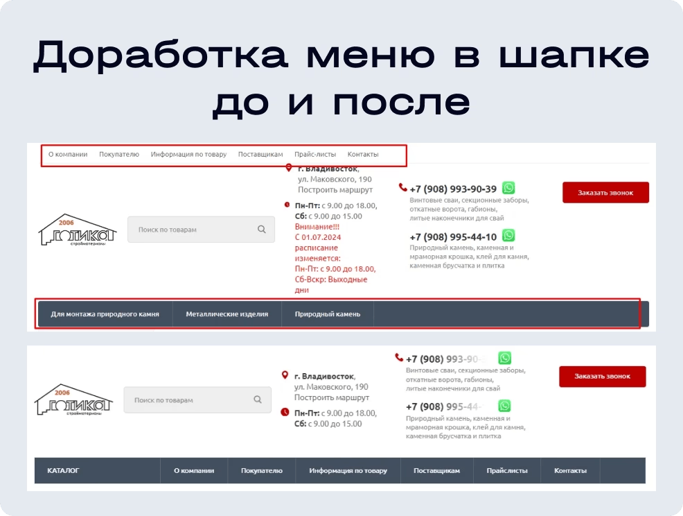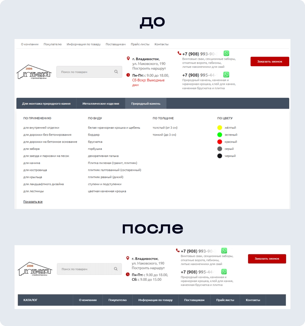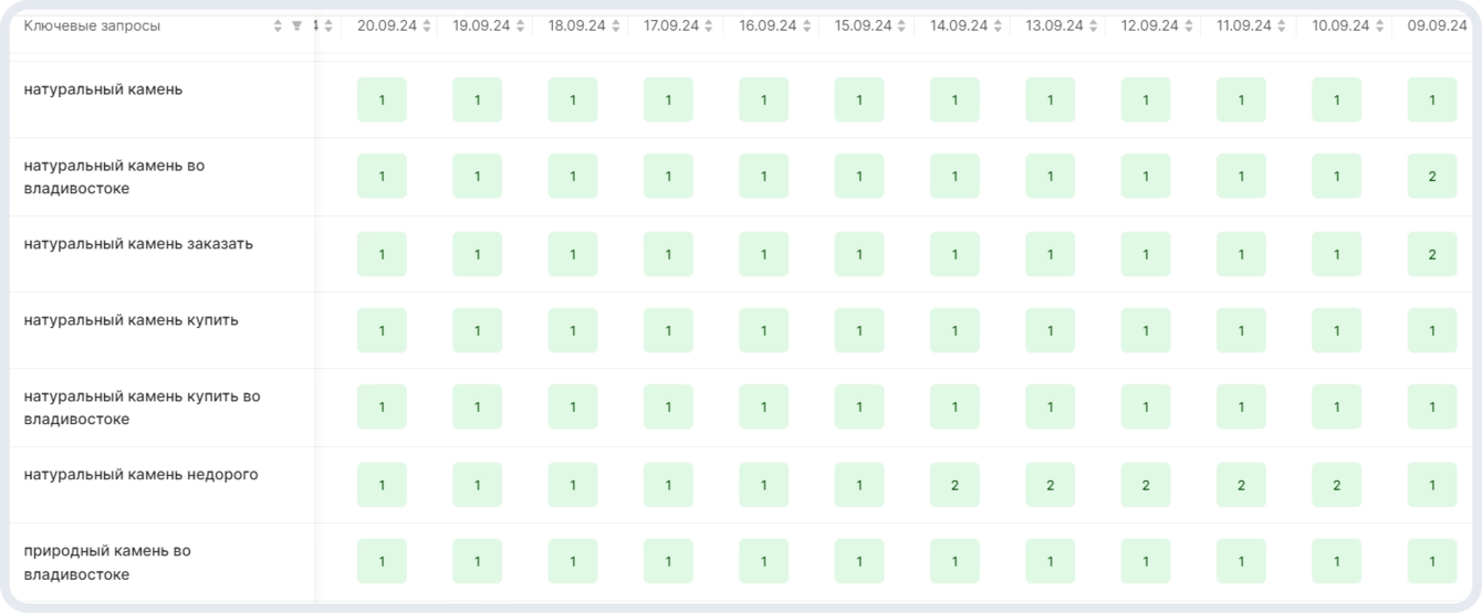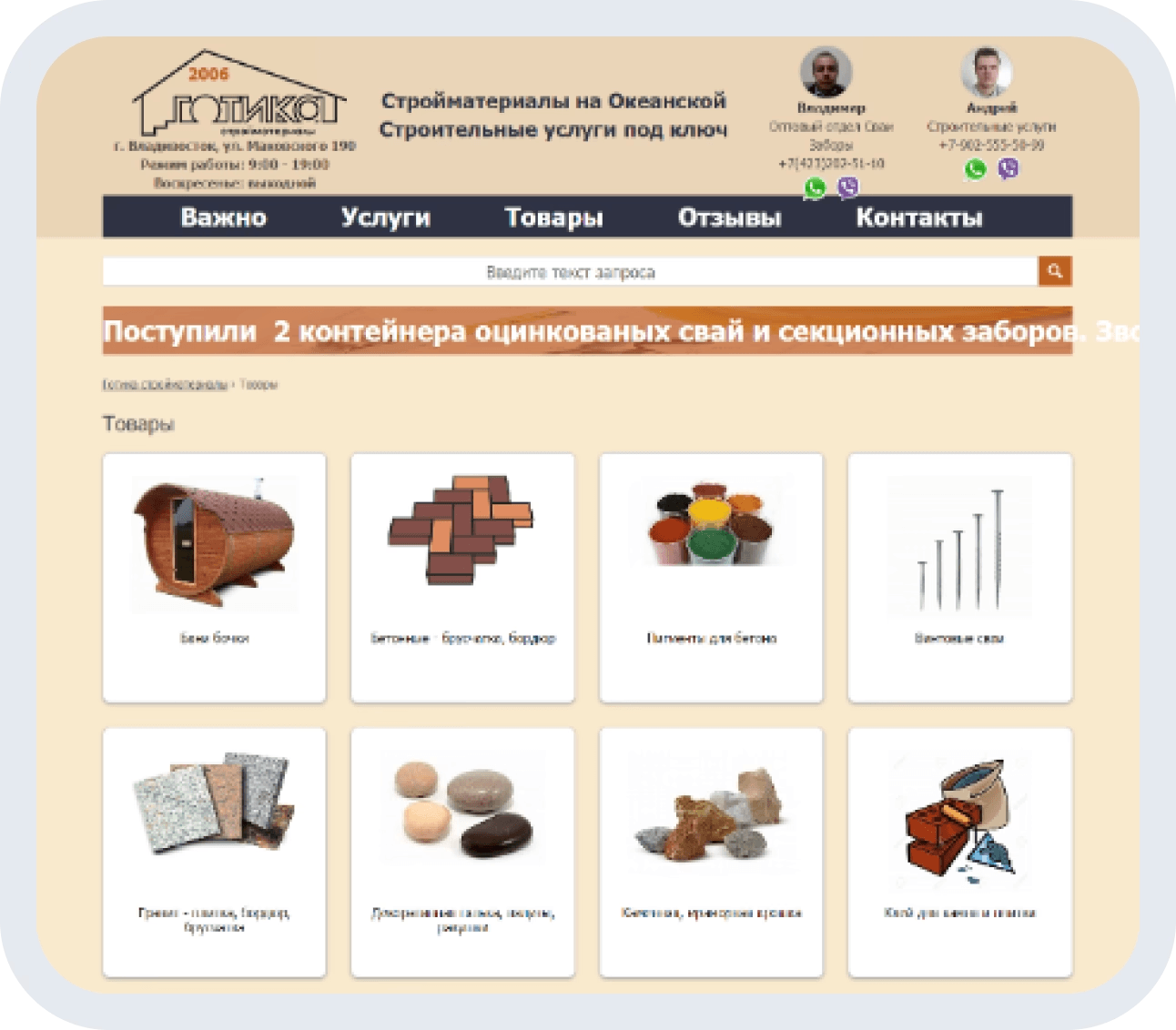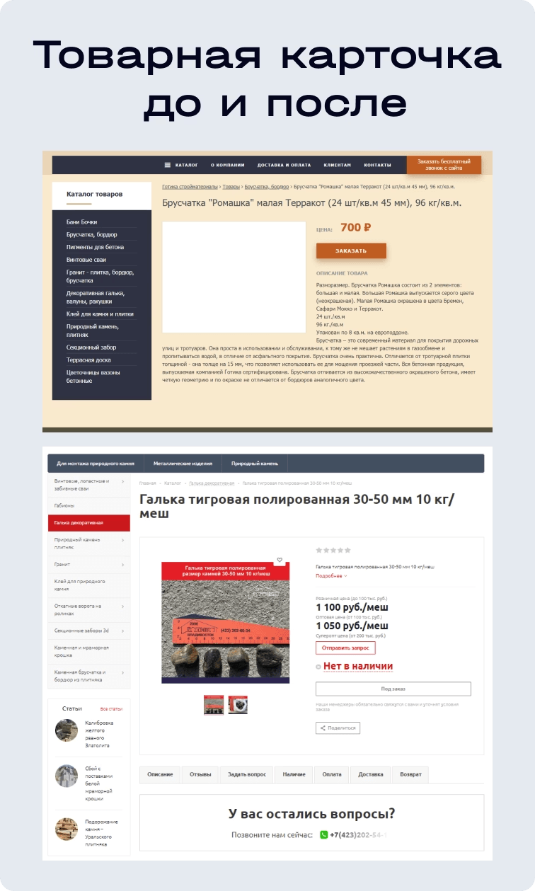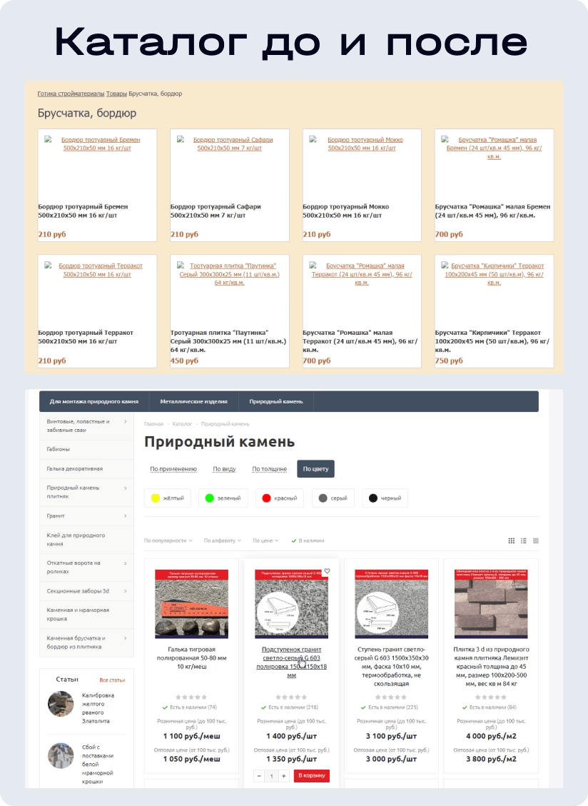 Семантика, с которой работаем, достаточно узкая, но мы осознанно отказались от высокочастотных запросов типа “строительные материалы”. Ниша клиента более специфична: с упором в продажу природных камней для дорожек, заборов, ландшафтного дизайна и металлических изделий для заборов, свай.