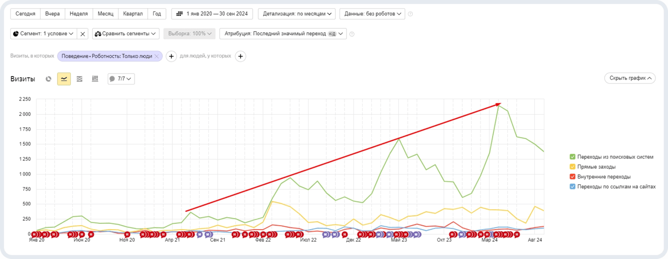 В пик сезона в 2020-2021 гг. трафик доходил до 300 визитов, постепенно каждый сезон трафик рос. К высокому сезону 2024 года мы вышли на 2100 визитов в месяц.