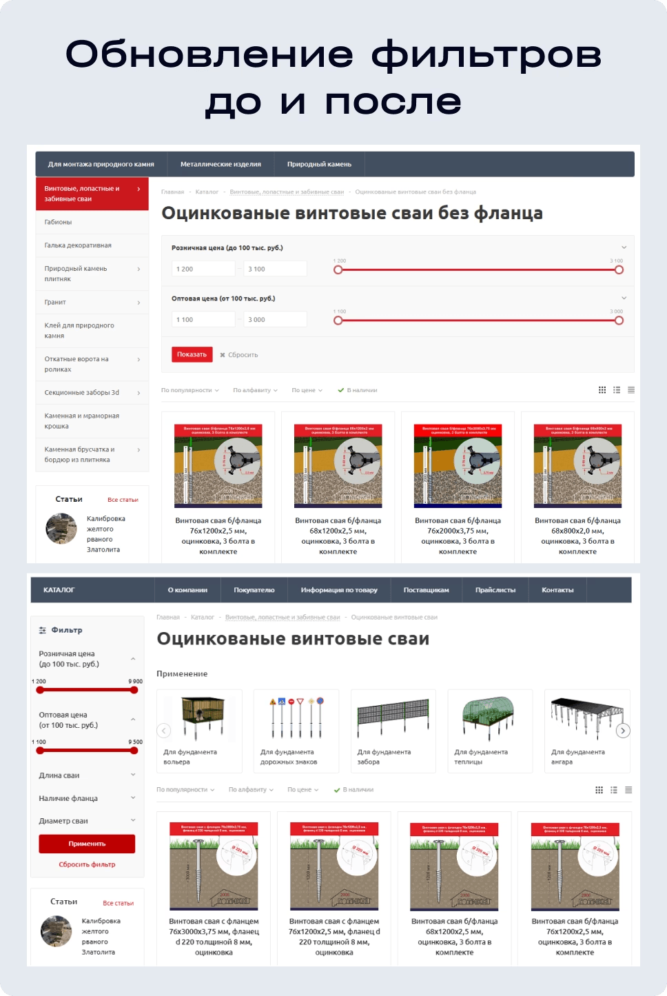 Да, в моменте мы выиграли с точки зрения продвижения – у нас появились релевантные страницы, которые можно продвигать в поиске. Но с точки зрения юзабилити, это решение было не совсем удобно для пользователя, так как ему приходилось добывать информацию о товаре из двух разных мест. Совместными усилиями мы решили проблему с выгрузкой фильтров на стороне клиента, чтобы убрать лишний каталог на сайте.