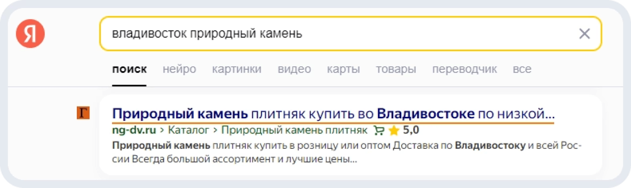Но при этом нам удалось попасть в выдачу и продвигать товары по запросам “натуральный камень”, хотя такие запросы по частотности больше подходят под сферу украшений из натуральных камней. И мы до сих пор держимся по ним на первом месте в выдаче и получаем часть трафика.