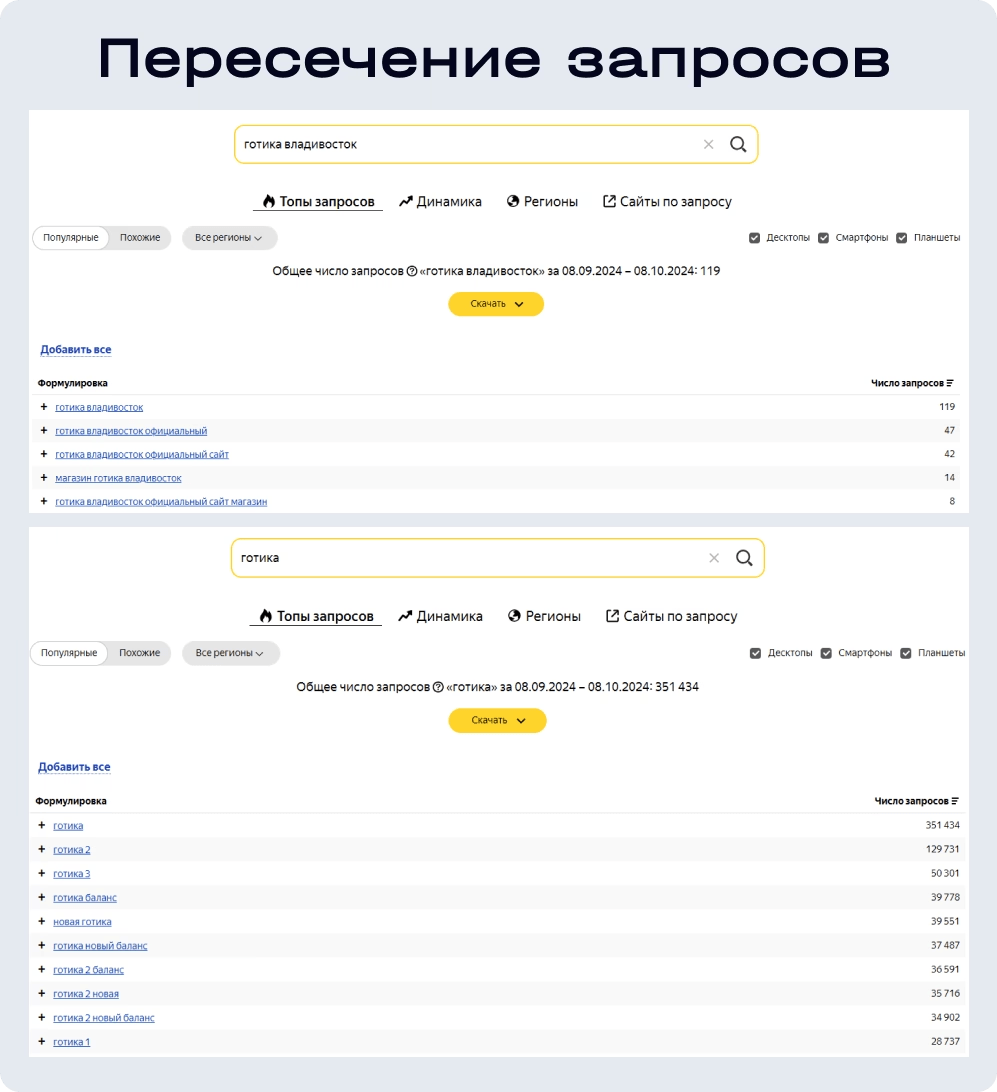 Название компании «Готика» – одноименное с популярной игрой, поэтому продвигать брендовые запросы в нашем случае сложнее. Приходится использовать географическую привязку, так как частотность по запросам, связанных с игрой, выше, и объективно нам ее не обойти.