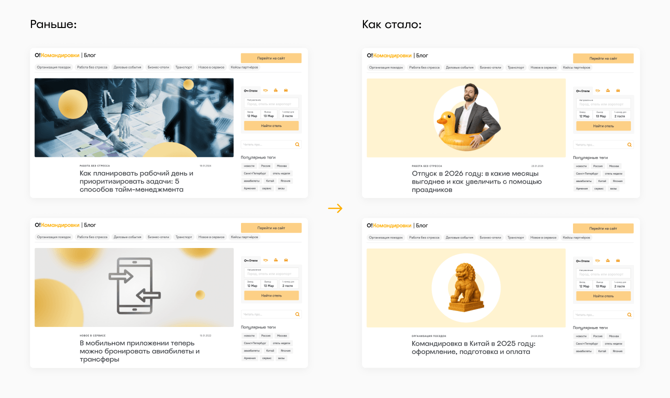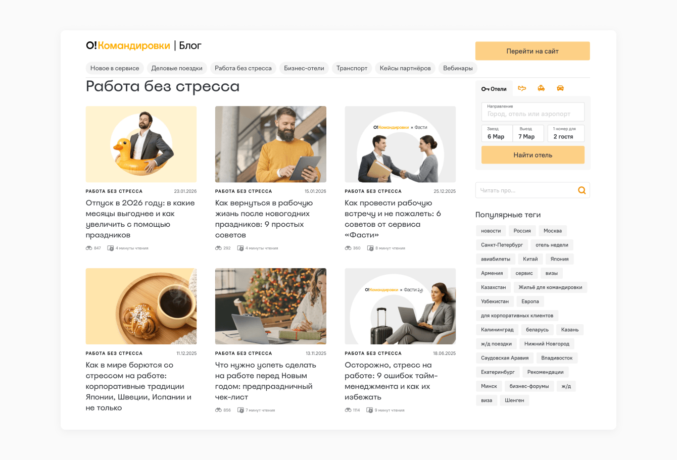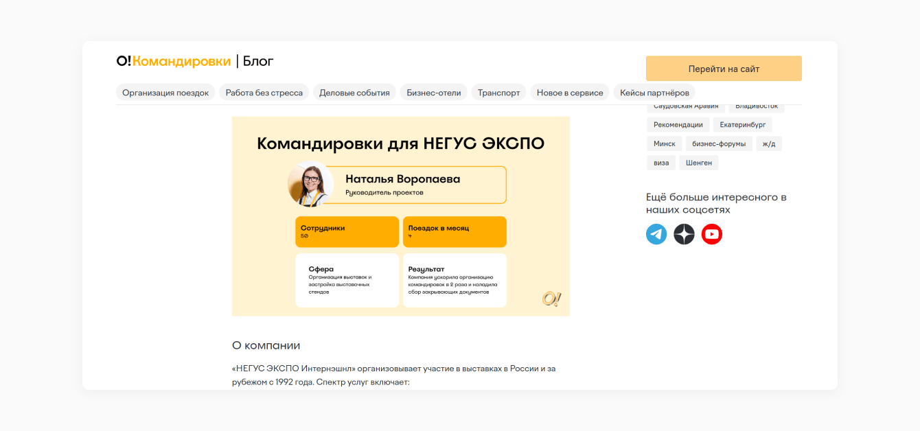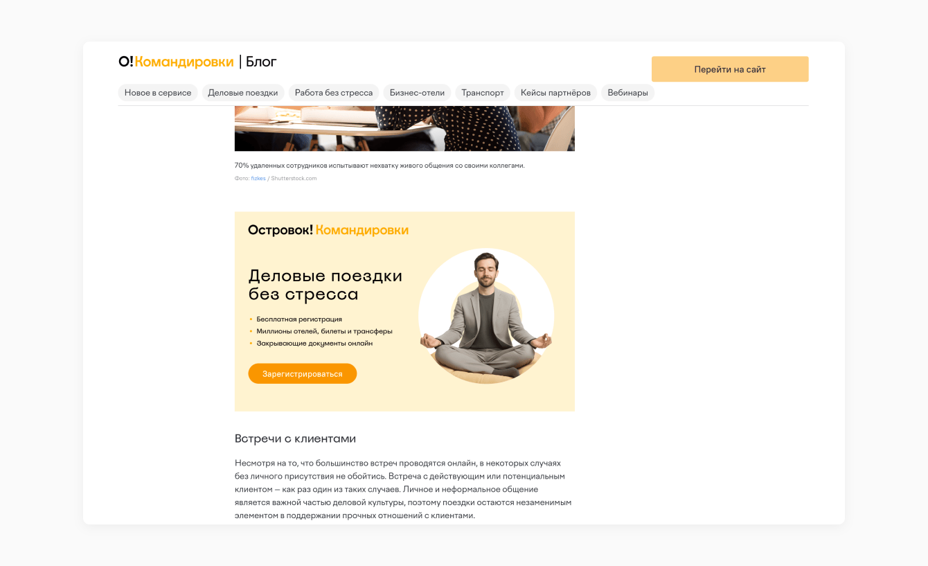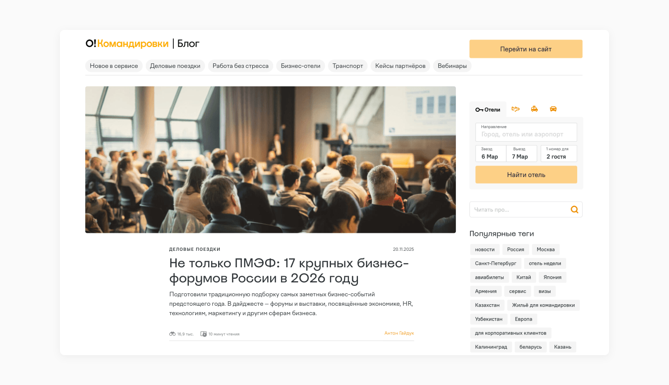 О! Командировки Блог — проект сервиса для организации деловых поездок Островок Командировки (входит в группу компаний «Островок»), появившийся в 2022 году. Команда запустила блог, чтобы регулярно сообщать текущим клиентам про обновления в продукте — на статьи-инструкции было удобно вести из социальных сетей и рассылок. Блог справлялся с этой задачей, но не помогал привлекать новые регистрации. Нужно было заинтересовать тех, кто организует поездки в компаниях (тревел- и офис-менеджеров), и привести их в сервис.