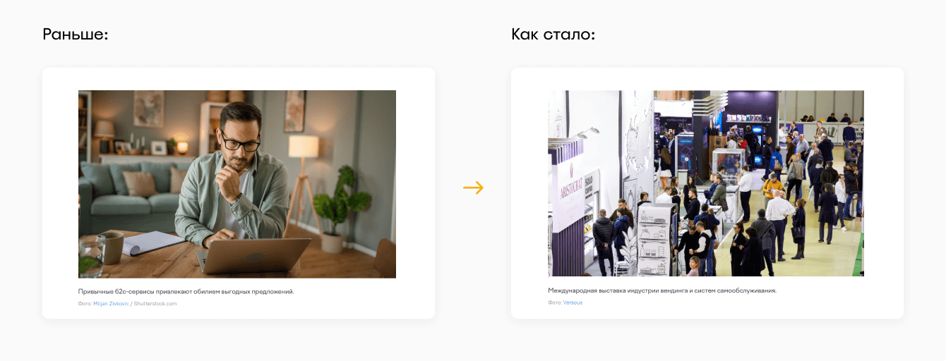 Раньше: стоковые изображения, которые не поддерживают визуальный сторителлинг и не несут пользы читателю.