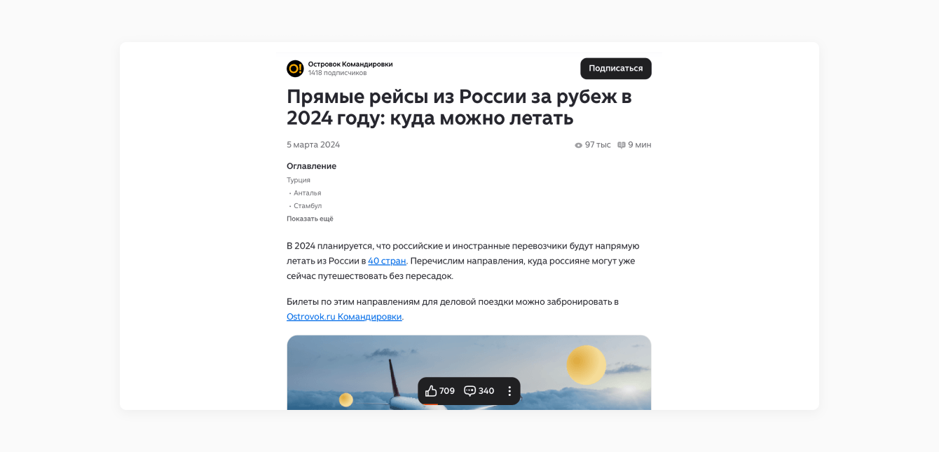 Тактика сработала: например, статья про перелёты из России набрала суммарно 97 000 просмотров, 709 лайков и 340 комментариев. Для сравнения, более нишевые тексты про командировки получали в среднем до 500 просмотров.