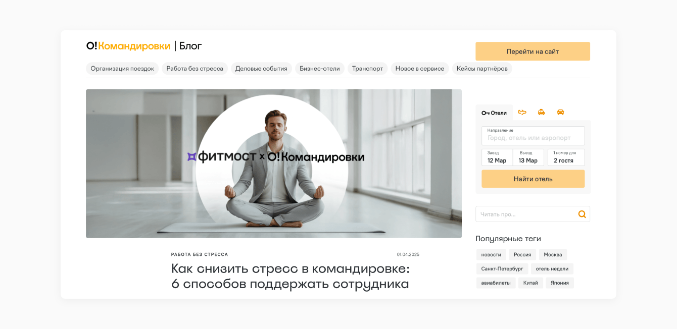Помимо этого, блог Островок Командировки сотрудничает с брендами, которые тоже помогают клиентам бороться со стрессом в разных сферах жизни: например, с сервисом для бронирования тренировок «Фитмост» и платформой для планирования онлайн-встреч «Фасти». В коллаборации с партнёрами мы рассказали читателям, как работодатель может позаботиться о сотруднике в бизнес-поездке, как справиться с рабочим хаосом и грамотно провести деловую встречу. Это помогло привлечь новую аудиторию, которой в дальнейшем может пригодиться наш сервис.
